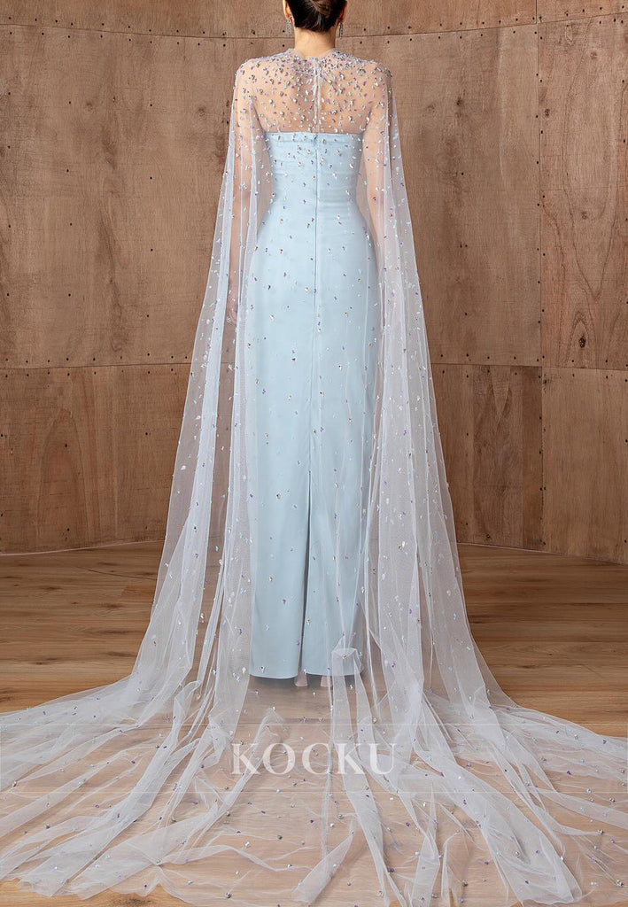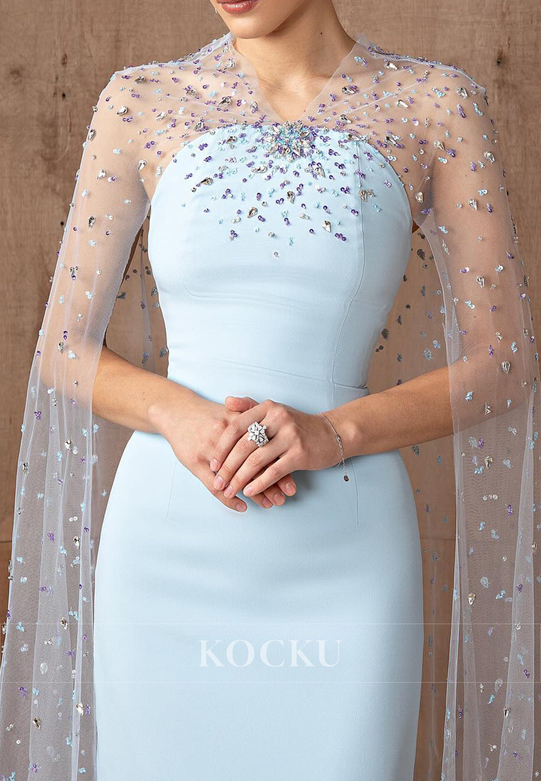 This sky blue mermaid prom dress features a floor-length silhouette enhanced by an illusion neckline adorned with intricate sequins. The shimmering embellishments create a delicate, ethereal effect, while the tailored fit flatters your figure elegantly. Combining graceful design with refined sparkle, this dress is perfect for making a sophisticated statement at any formal occasion.