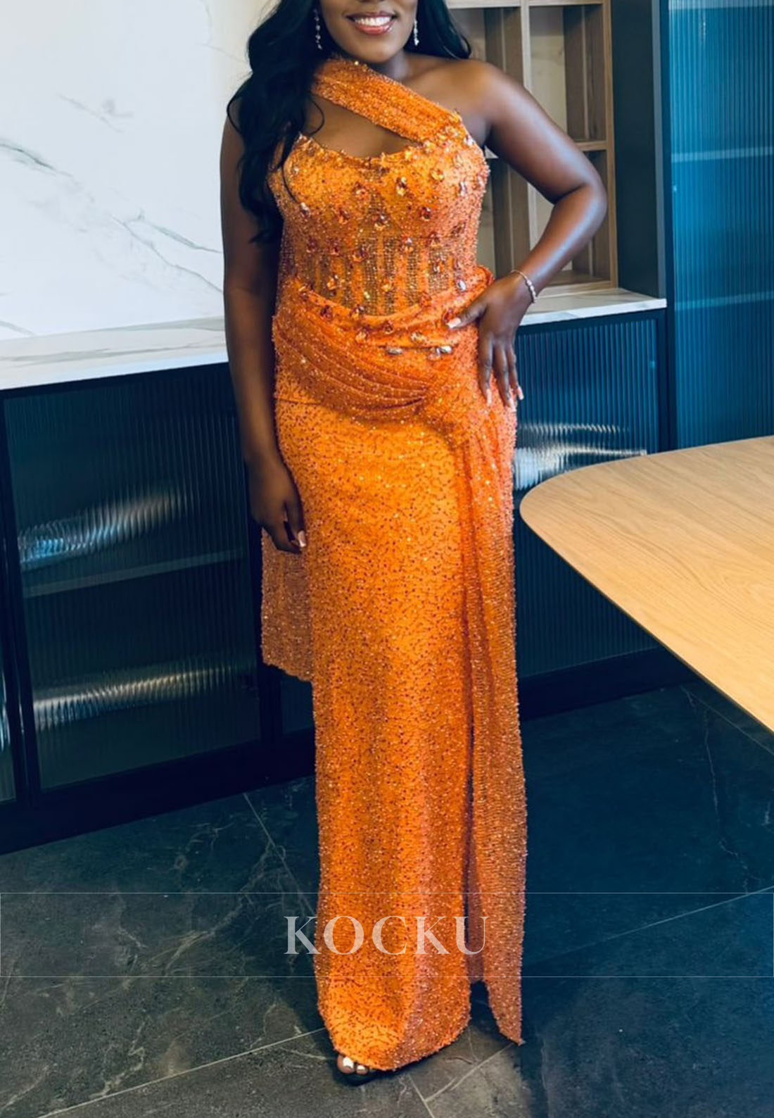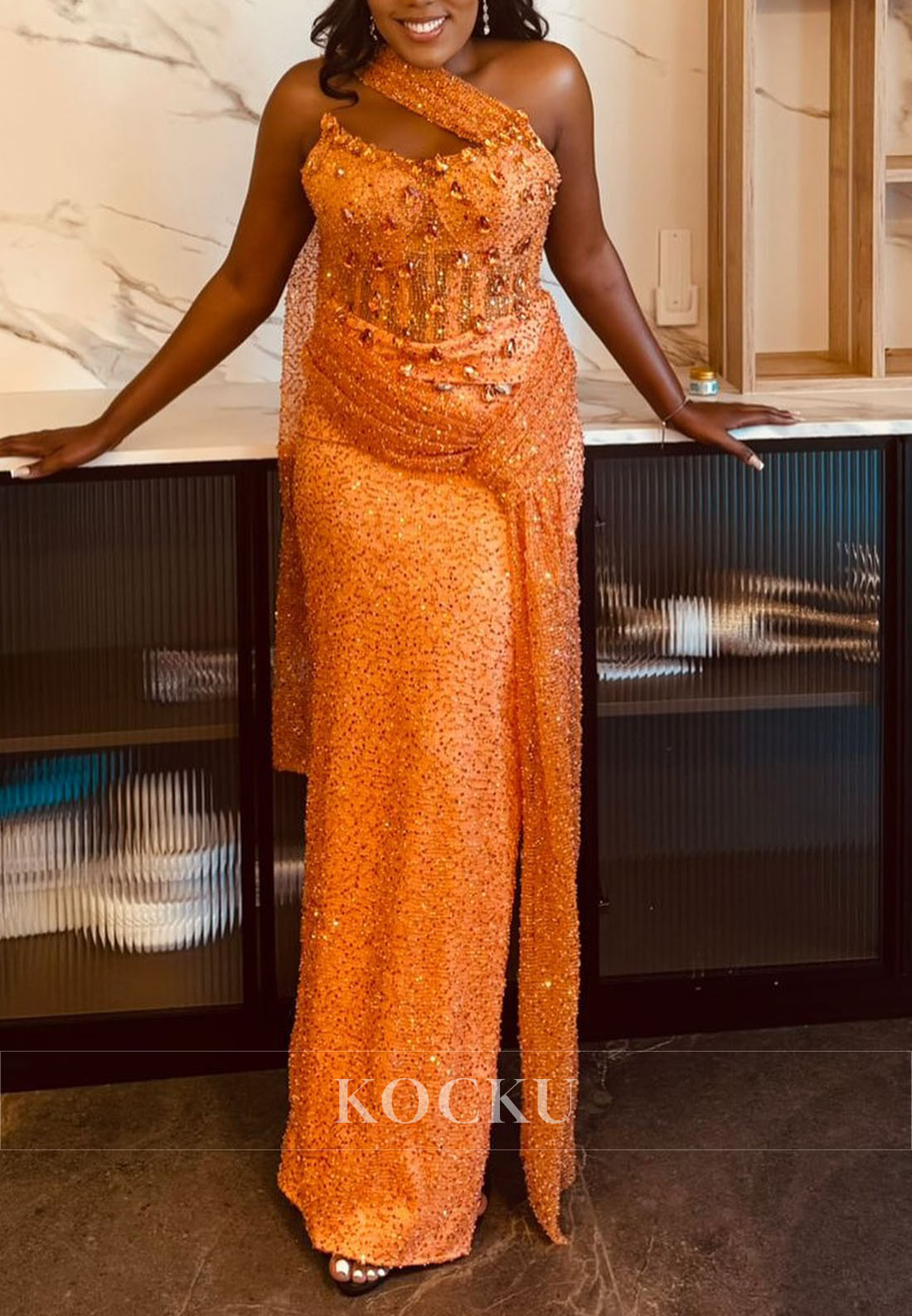 Radiate confidence in this striking orange prom dress that commands attention with bold elegance. The asymmetrical one-shoulder neckline creates a modern, sophisticated silhouette while showcasing one shoulder with refined allure. Luxurious rhinestones and intricate beading embellish the bodice, casting brilliant sparkle that catches every eye. The fitted sheath cut hugs your curves beautifully, offering a streamlined and polished appearance from shoulder to hem. Perfect for those seeking contemporary glamour with dazzling embellishment and timeless sophistication.