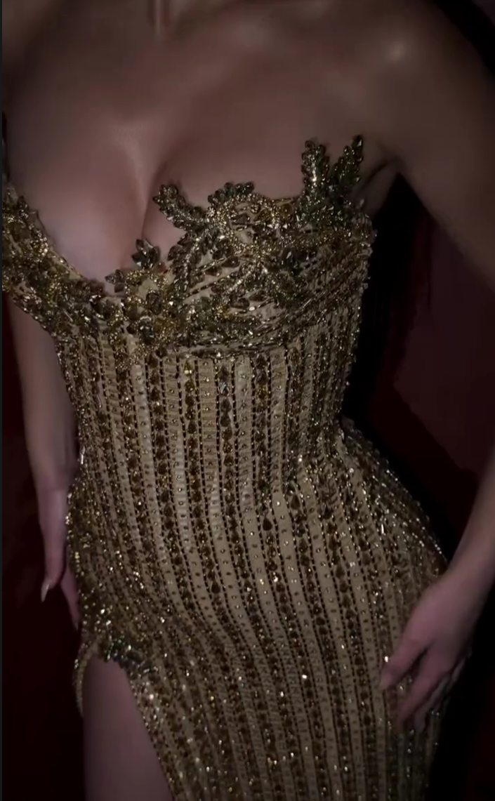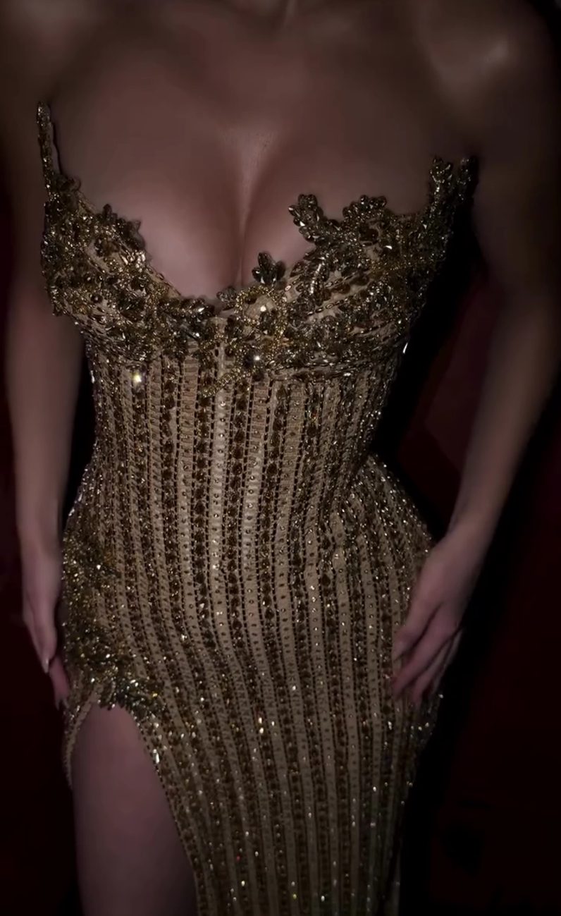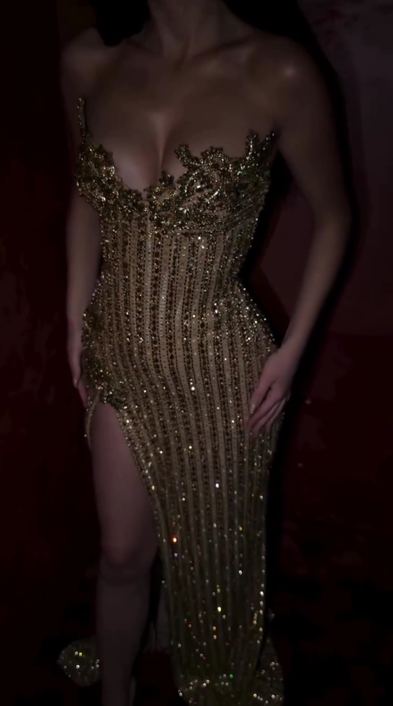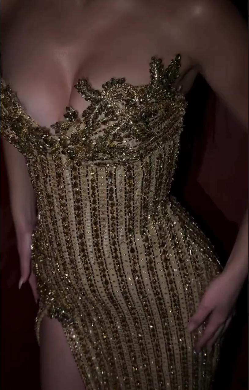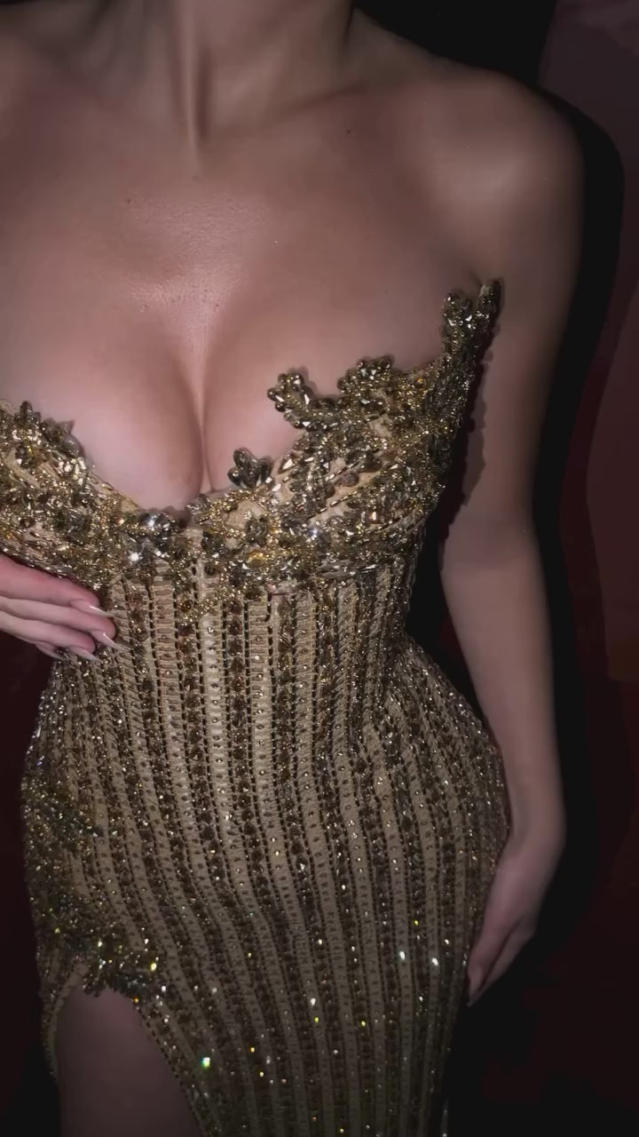 Sheath Asymmetrical Neck Side Slit Full Beadin Prom Dress - Gold is backordered and will ship as soon as it is back in stock.