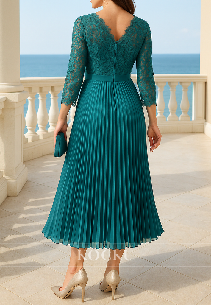 3/4 Sleeve - A-Line V Neck Tea-Length Pleated Mother of Bride Dresses