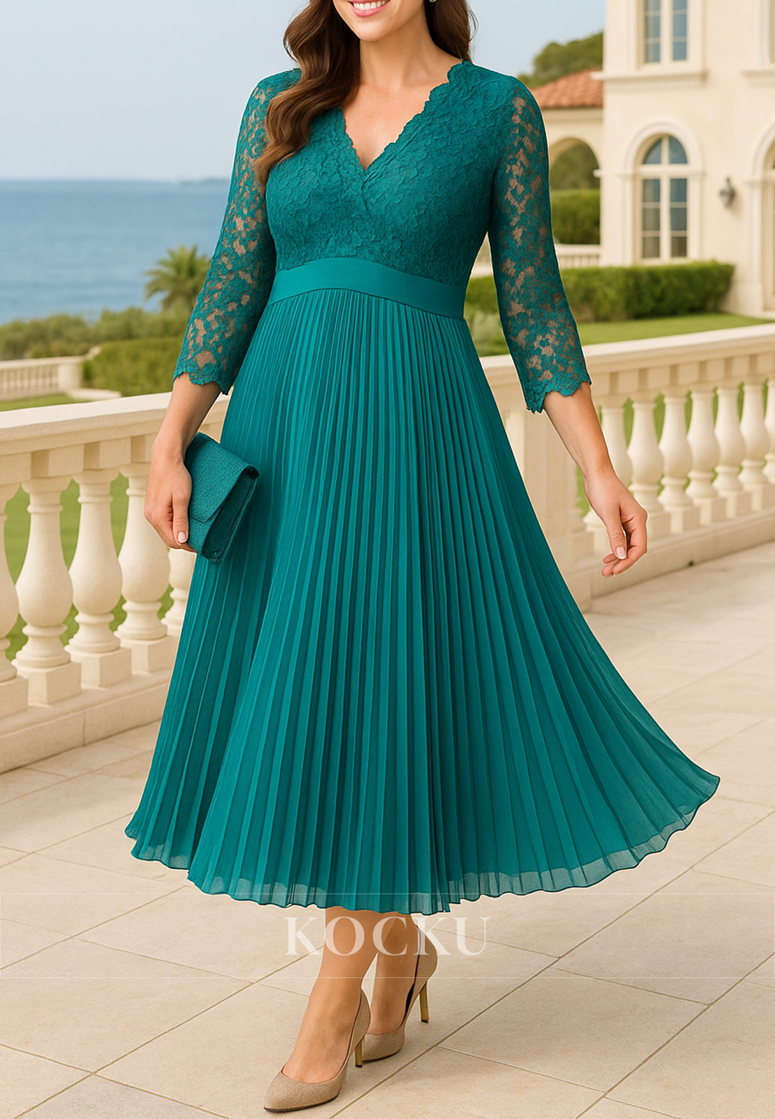 This elegant mother of the bride dress features a flattering A-line silhouette with a tea-length hem that offers graceful movement. The 3/4 sleeves provide modest coverage while maintaining a sophisticated look. Designed with a V-neckline and delicate pleating, this dress combines classic style with refined details, making it an ideal choice for formal weddings. The structured pleats add texture and dimension, enhancing the dress’s timeless appeal and ensuring a comfortable, flattering fit for the special day.