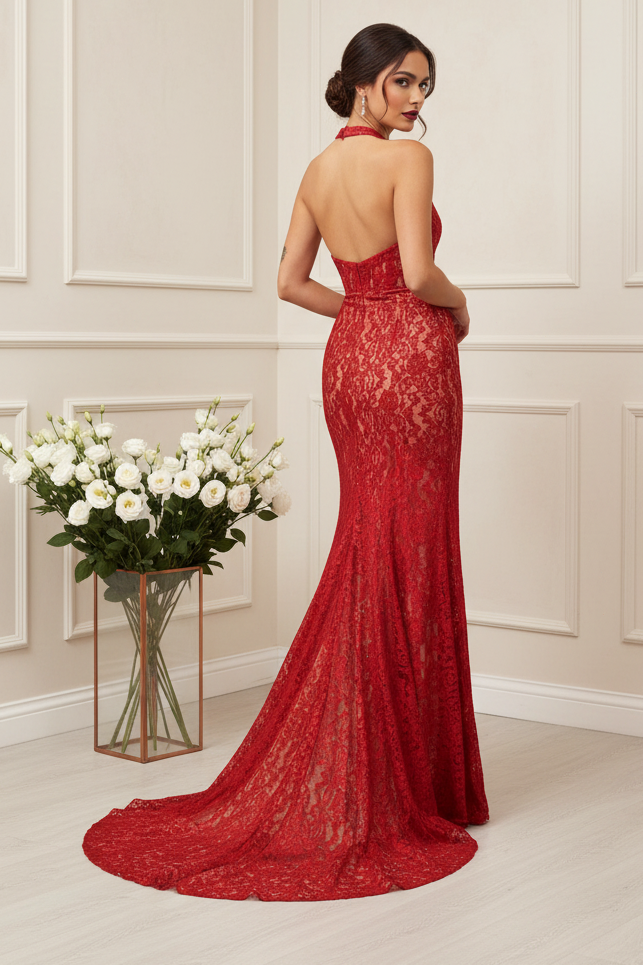 Make a stunning entrance in this sophisticated red lace halter mermaid gown. The intricate lace detailing creates an elegant silhouette that hugs your curves, while the dramatic slit adds movement and allure. The halter neckline provides flattering support and a refined look perfect for prom, galas, or formal evening events. This show-stopping dress combines timeless elegance with contemporary design, ensuring you'll feel confident and radiant all night long.
