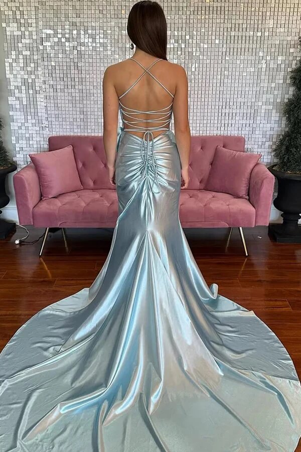 Satin Mermaid V Neck Spaghetti Straps Prom Dresses With Bow