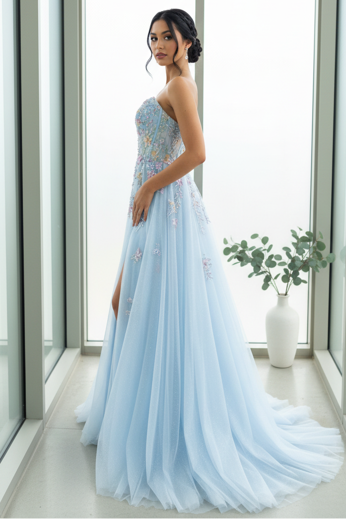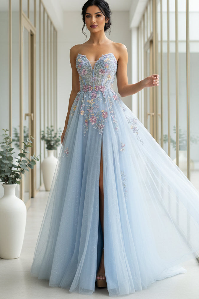 This Romantic Light Blue Strapless Floral Appliqué Tulle Prom Dress with Flowing Train features a classic strapless neckline that beautifully highlights the shoulders and collarbone. Delicate floral appliqués adorn the airy tulle, adding soft texture and a romantic, fairytale feel. Finished with a graceful flowing train, this gown creates elegant movement and is perfect for prom, formal events, and special occasions where timeless romance takes center stage.