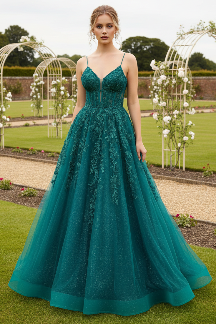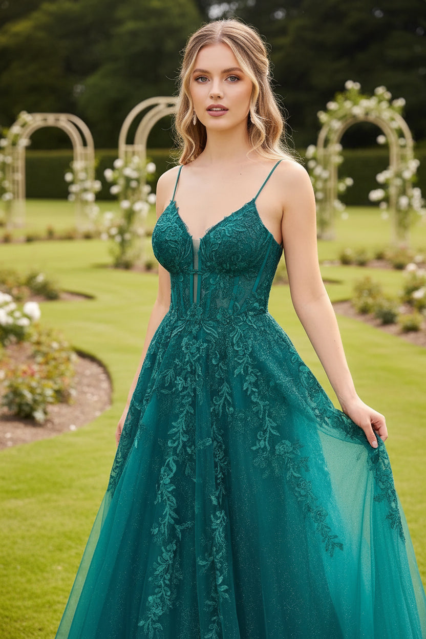 Elevate your prom night with this stunning shiny green A-line dress, designed to turn heads and capture the spotlight. The delicate spaghetti straps offer a sophisticated silhouette while the flowing A-line skirt provides graceful movement and flattering coverage. Intricate appliqués add dimensional detail and refined elegance to the bodice, creating a dress that balances timeless glamour with contemporary style. The lustrous green fabric catches light beautifully, ensuring you'll radiate confidence throughout the evening. Perfect for those seeking a show-stopping look that combines classic prom aesthetics with modern sophistication.