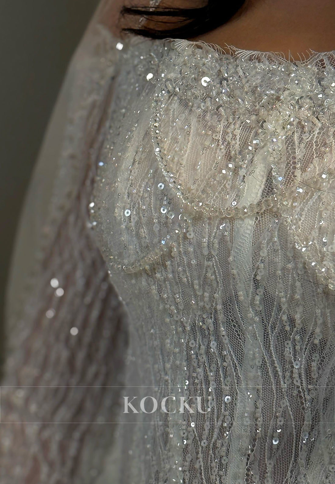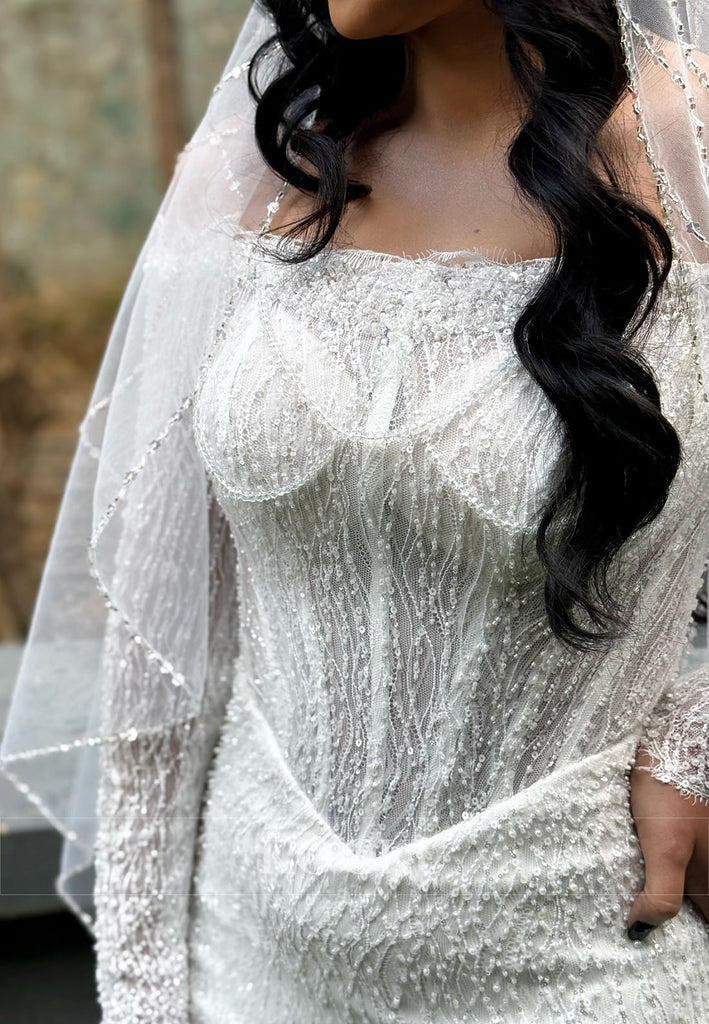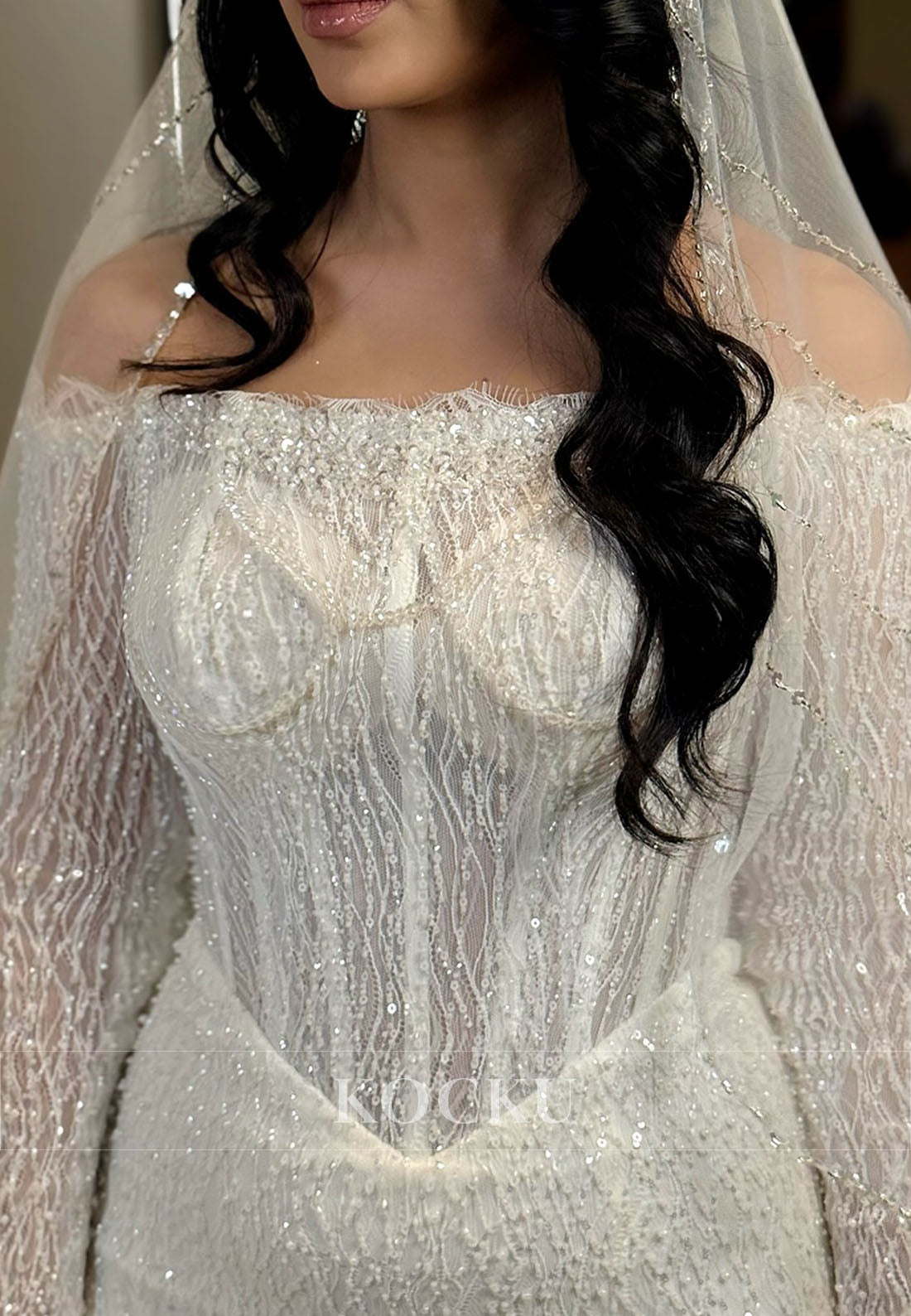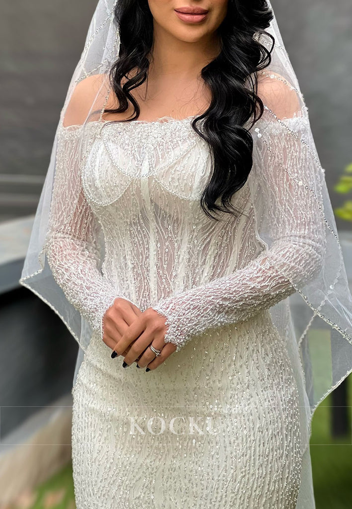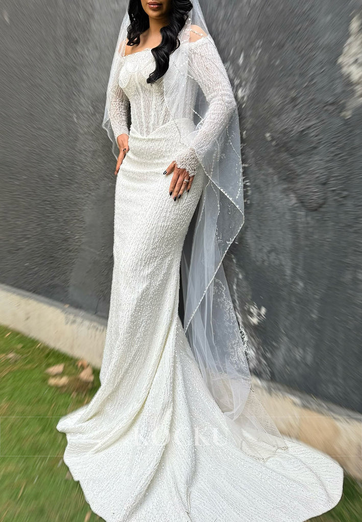 Command attention in this sleek sheath wedding dress that balances modern minimalism with luxurious detail. The off-shoulder design elegantly frames the collarbone and shoulders, while long sleeves add sophistication and graceful coverage. Radiant beading embellishes the gown, creating luminous accents that enhance your natural beauty throughout the celebration. The sweeping train adds dramatic flair and movement, ensuring you make a memorable entrance and exit. This streamlined silhouette flatters the figure while the refined embellishments provide just enough glamour—an excellent choice for the contemporary bride who values understated elegance and polished craftsmanship.