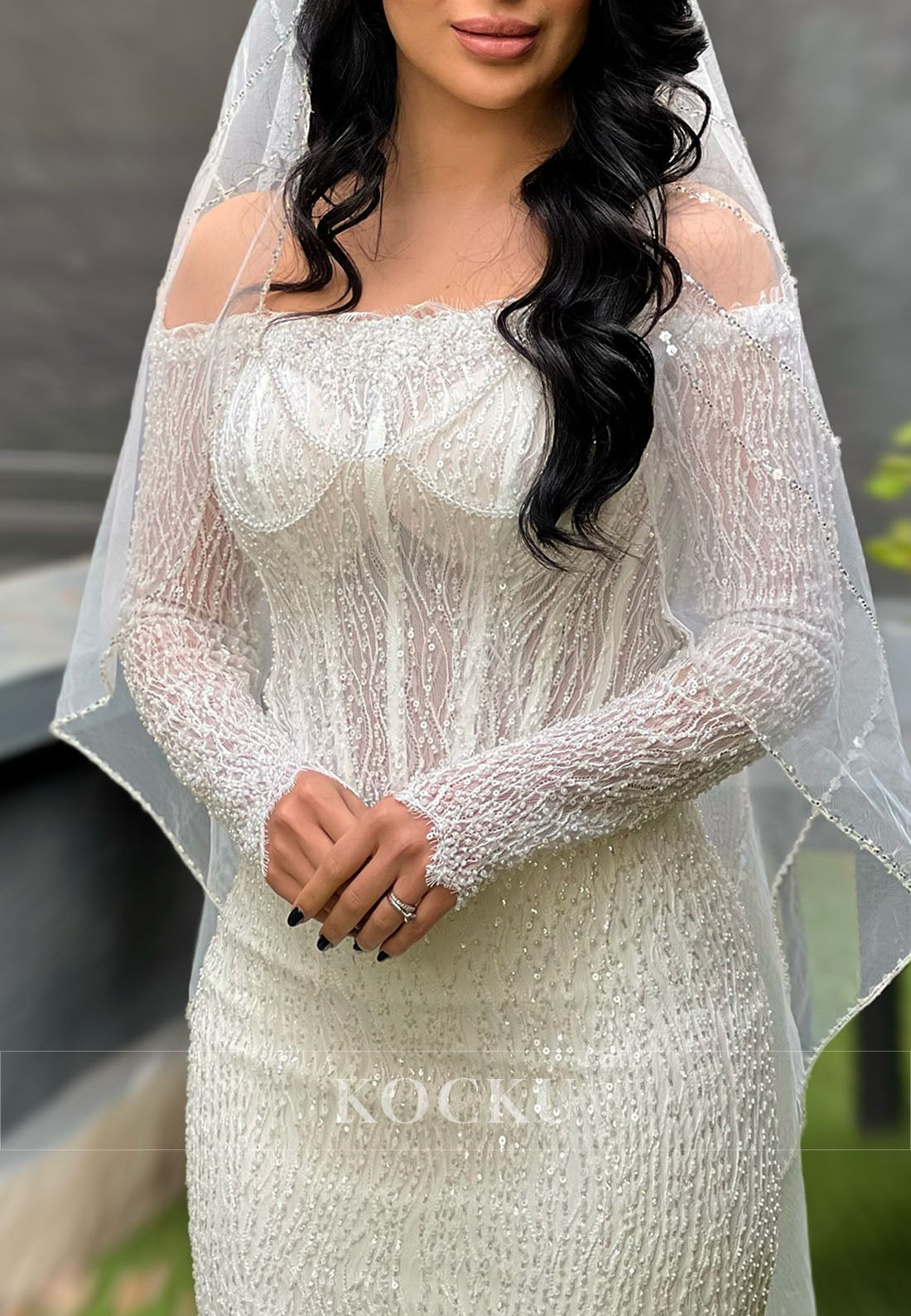 Sheath Off Shoulder Long Sleeves Beaded Sweep Train Wedding Dress