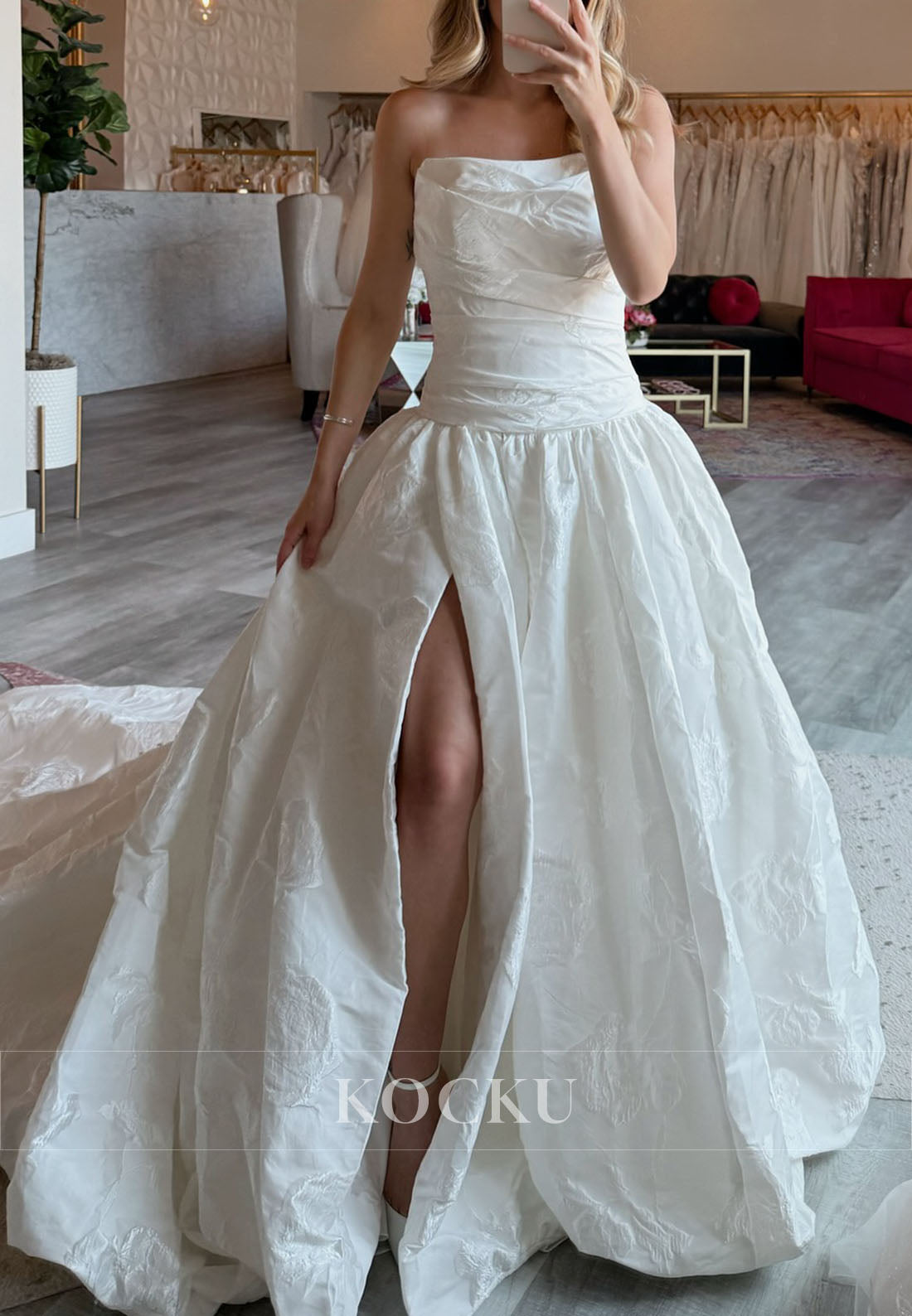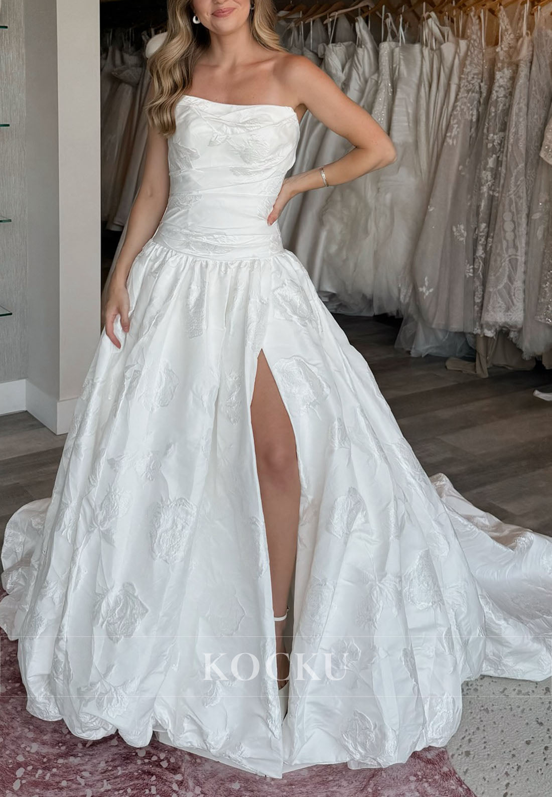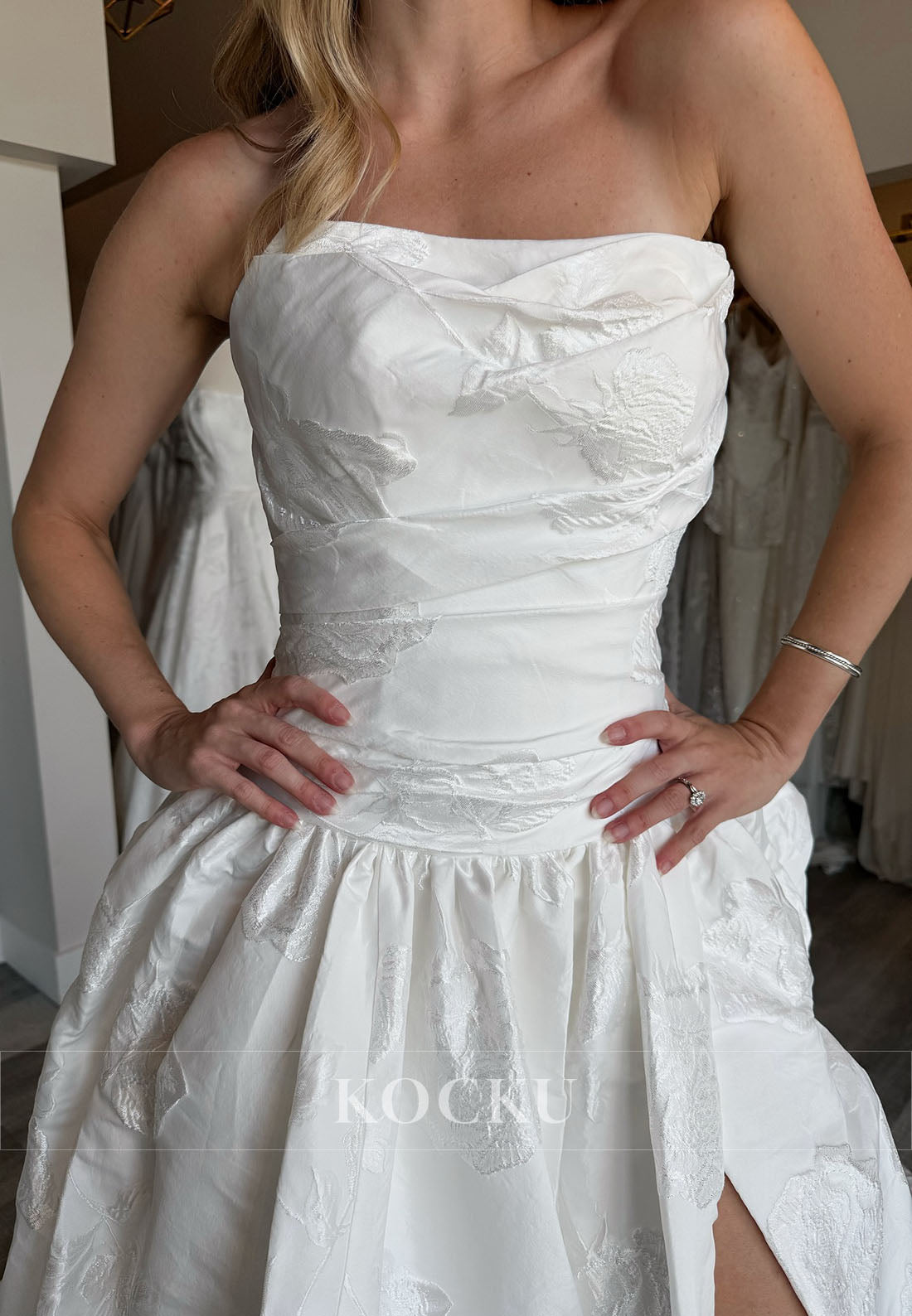 This distinctive A-line wedding dress showcases a modern tube top silhouette paired with romantic floral elements throughout. The sleeveless design creates clean, contemporary lines while the structured bodice provides excellent support and comfort. Intricate floral detailing adorns the gown, adding natural beauty and dimension to your bridal look. The sweeping court train creates a dramatic, regal presence as you walk. Expertly constructed for both style and wearability, this dress bridges classic bridal tradition with fashion-forward design, making it ideal for the modern bride seeking something uniquely memorable.