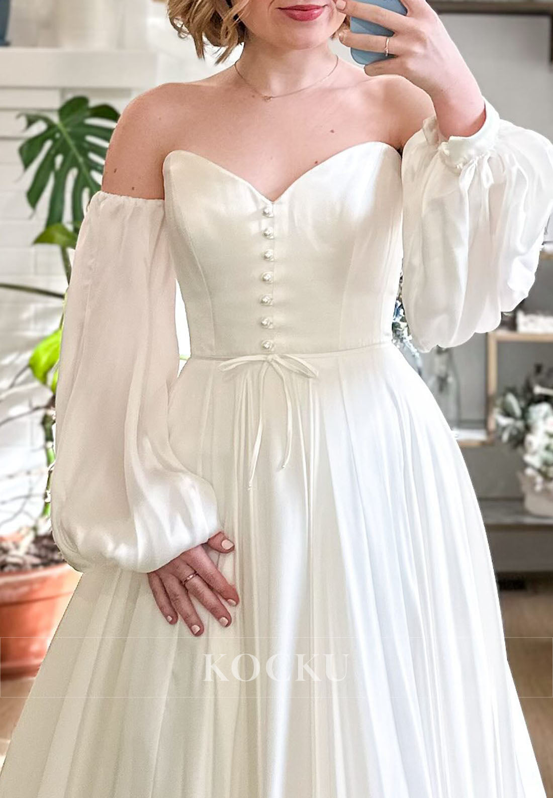 A-Line Swetheart Long Puff Sleeves Court Train Wedding Dress - Ivory está em espera e será enviado assim que estiver de volta em estoque