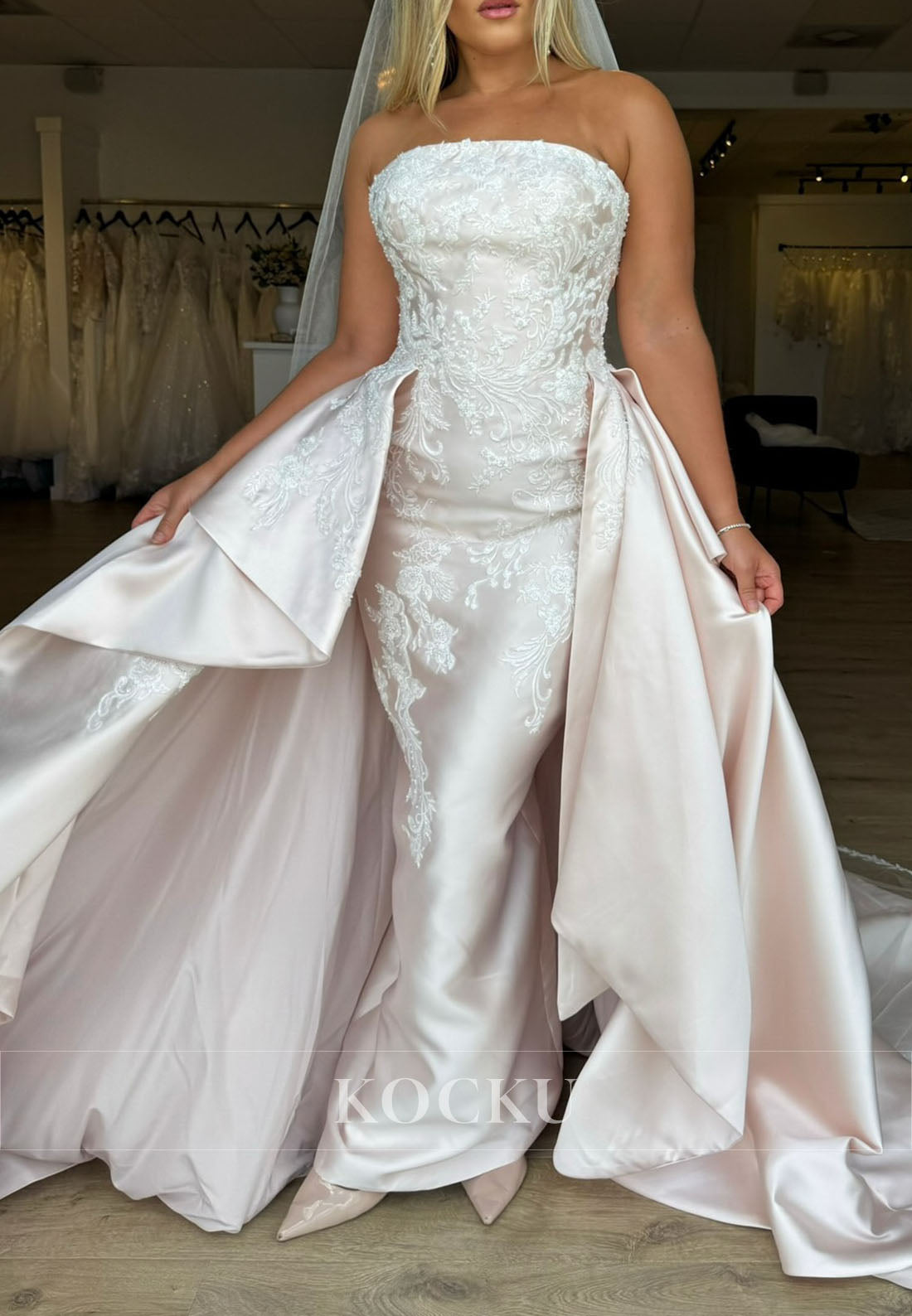 This exquisite blush-toned wedding dress features a sleek tube top silhouette that creates a modern, streamlined neckline while maintaining timeless bridal appeal. Intricate embroidery adorns the bodice and skirt, adding luxurious detail and visual richness without overwhelming the design. The fitted construction emphasizes the bride's silhouette before transitioning into an elegant court train that commands attention during the ceremony and photographs beautifully. An ideal choice for contemporary brides seeking a sophisticated blend of minimalist styling and ornate craftsmanship.