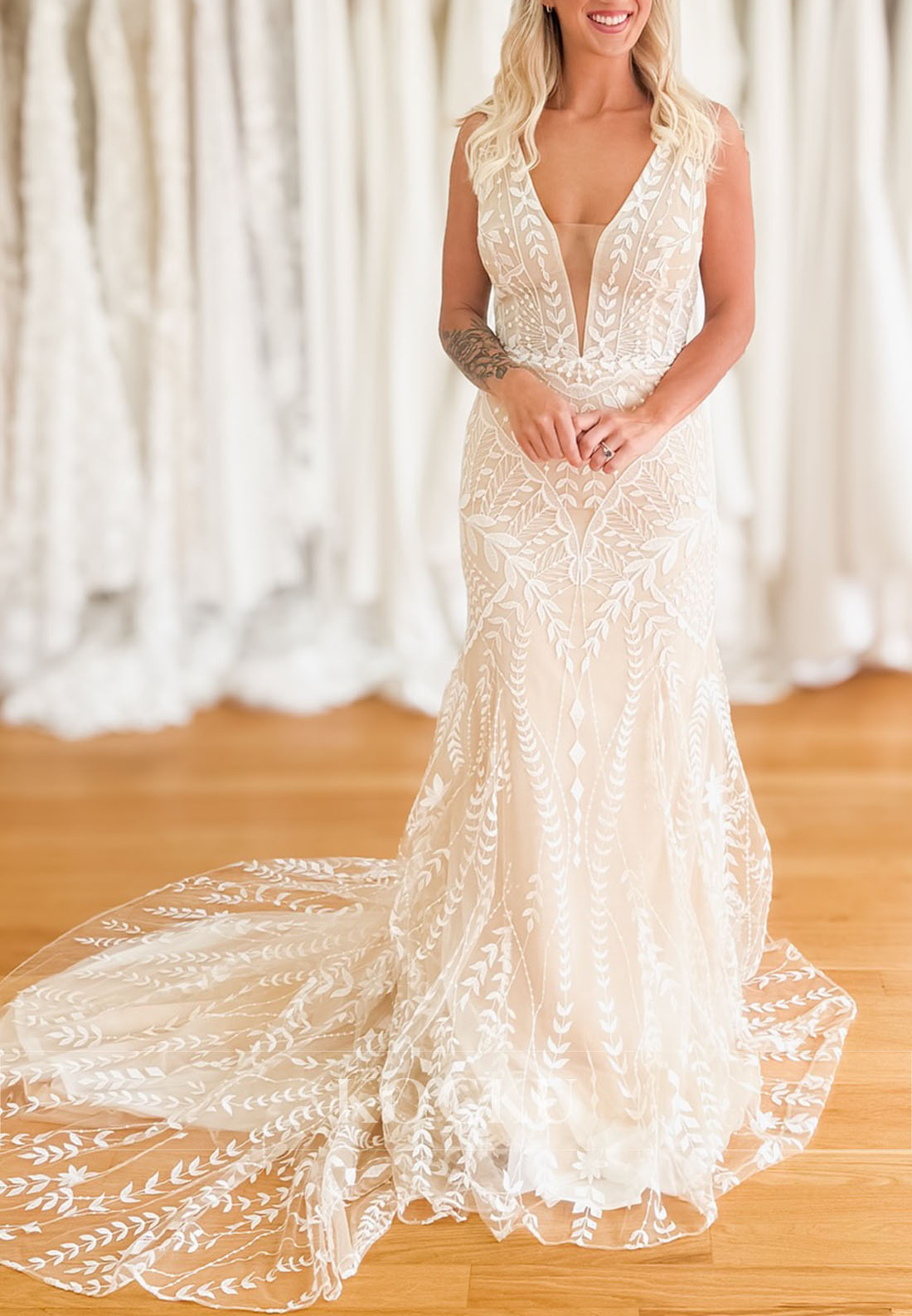 Embrace romantic elegance with this mermaid silhouette wedding dress, designed for the modern bride seeking timeless sophistication. The plunging V neckline and sleeveless cut create a flattering, contemporary look, while intricate lace detailing adds vintage-inspired charm. The fitted bodice gracefully transitions into a flowing skirt that sweeps the floor, offering movement and drama as you walk down the aisle. Perfect for bohemian and garden-style ceremonies, this dress combines delicate femininity with structured tailoring for a wedding day look that feels both ethereal and refined.