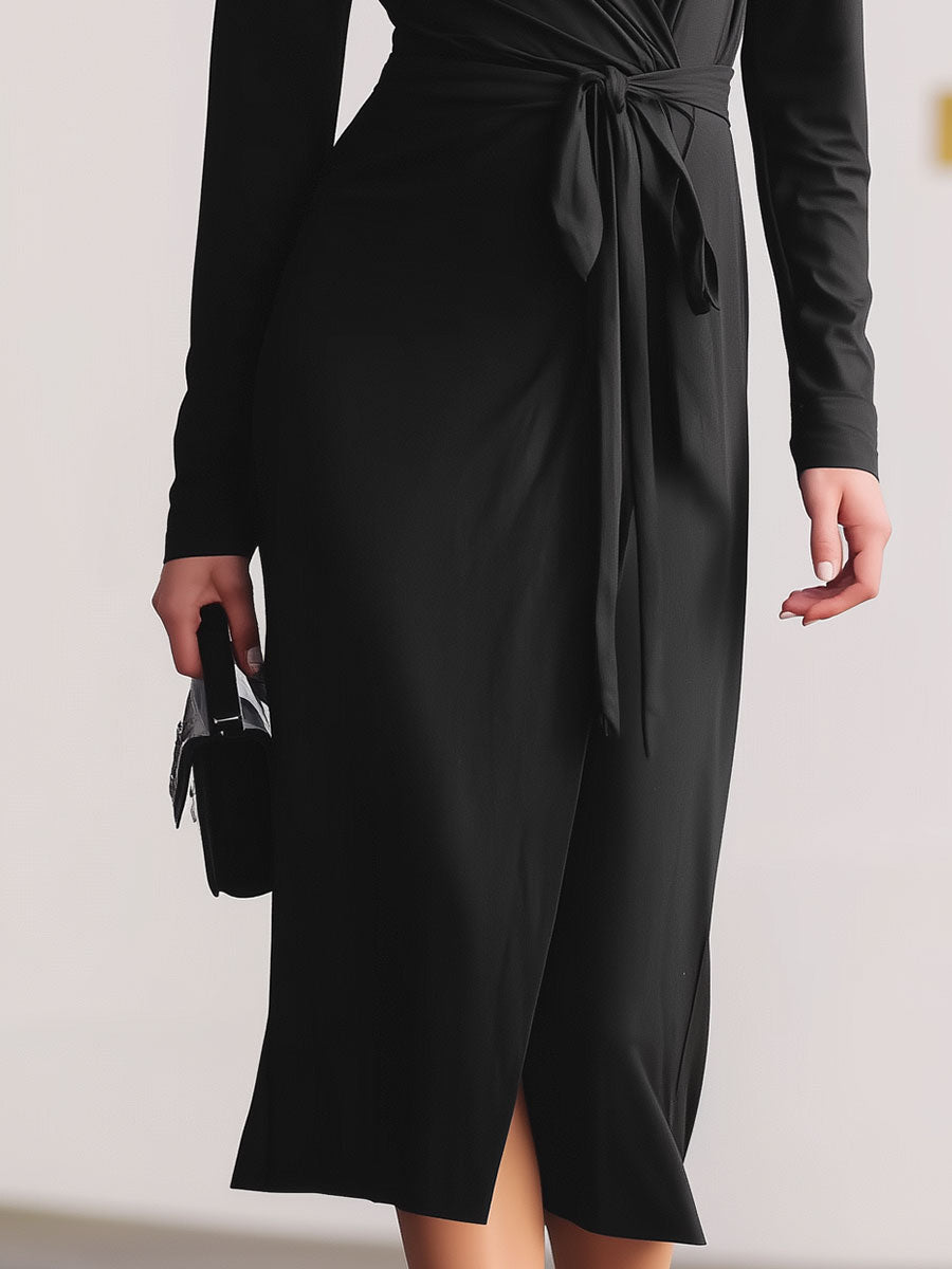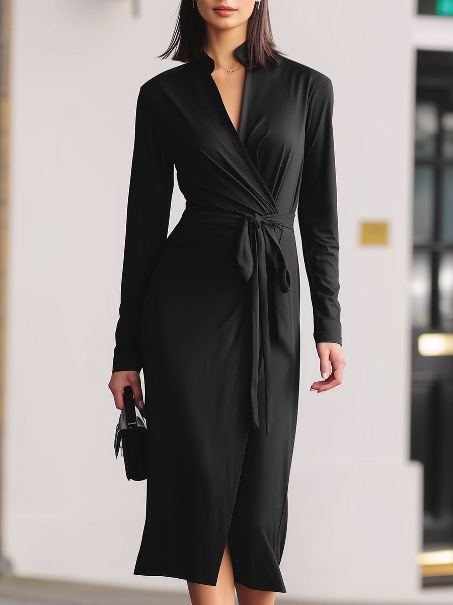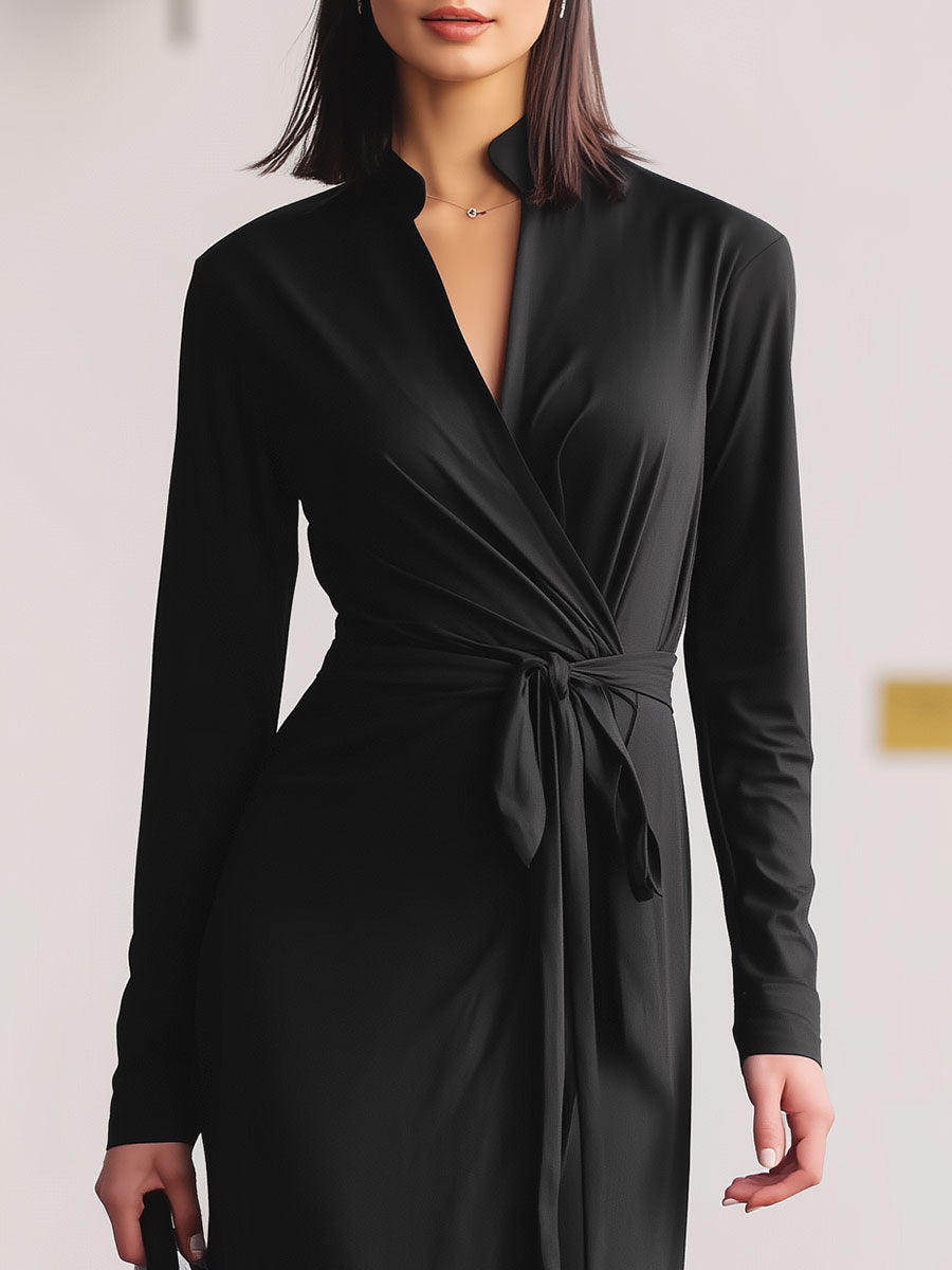KOCKU presents the Elegant Black Wrap Midi Dress, crafted for the modern woman who exudes understated glamour and effortless sophistication. The dress features a sleek black hue, a chic wrap design with a tied waist detail, a subtle stand-collar V-neck, and long sleeves, creating a silhouette that’s both figure-flattering and elegantly versatile.