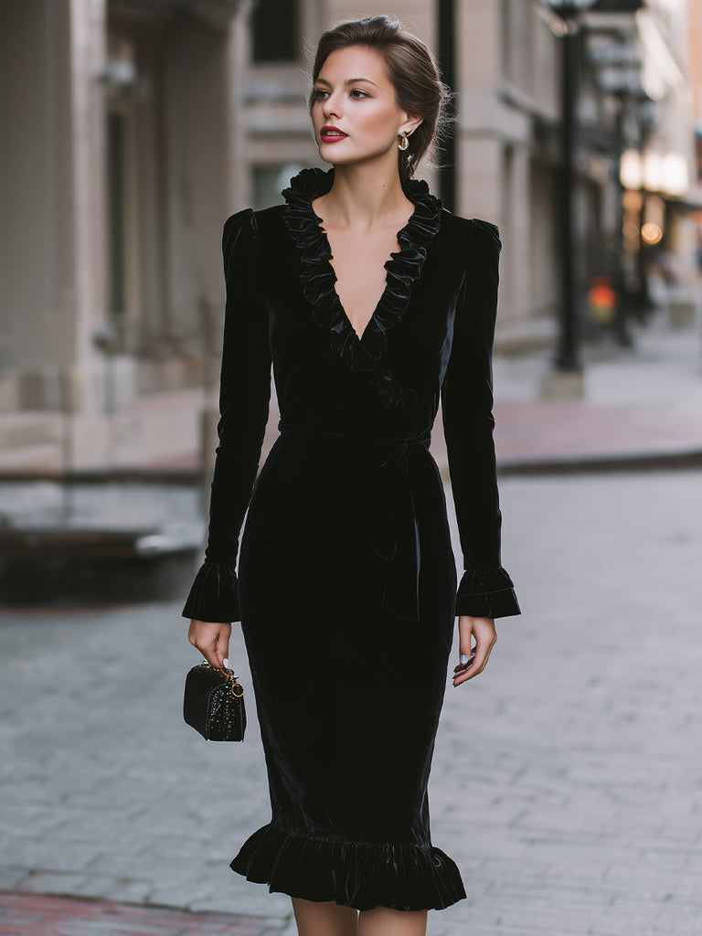 KOCKU presents the Elegant Black Velvet Ruffled Wrap Dress is crafted for those who seek timeless glamour. The dress features a deep V - neckline adorned with delicate ruffles, puff shoulders, and flared cuffs, exuding a sense of vintage allure. With a wrap design and a matching belt that cinches the waist, plus a ruffled hem, it seamlessly combines sophistication with a touch of romance.