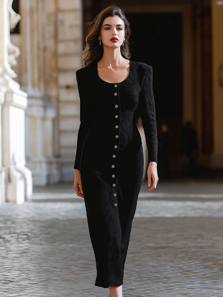 Elevate your everyday elegance with this black ribbed knit midi dress, designed to highlight the feminine silhouette while offering unmatched comfort. The deep scoop neckline and structured long sleeves create a sophisticated profile, while a line of decorative metallic buttons runs down the front, adding subtle polish.