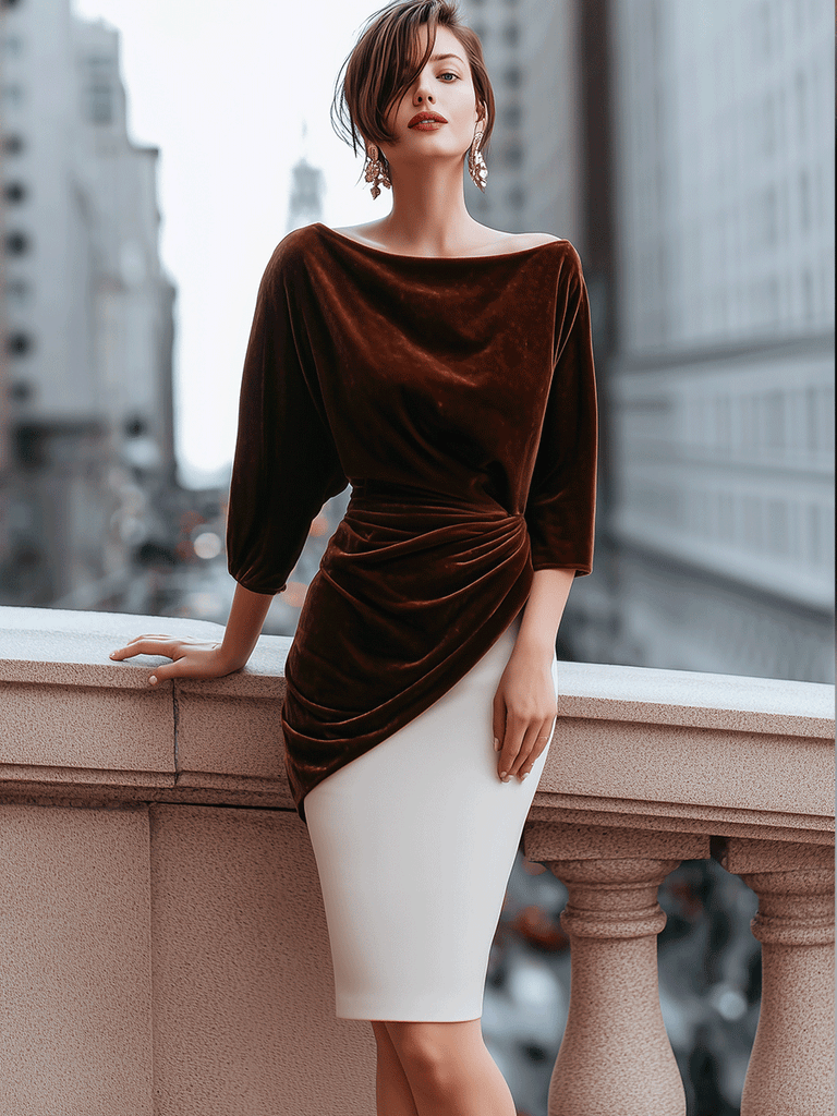 KOCKU presents an elegant two-tone velvet draped midi dress that captures the essence of refined allure and sculpted femininity. Designed for the modern woman with a taste for sophistication, this dress blends soft texture with clean architectural lines. The rich chocolate-brown top drapes gracefully over the shoulders, creating a fluid, batwing silhouette that contrasts beautifully with the sleek ivory pencil skirt. The asymmetric waist gathers subtly to accentuate the figure, offering both comfort and elegance in motion.