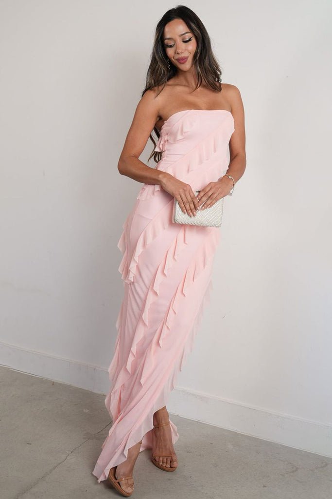 Fashion Sheath Strapless Pink Long Prom Dress with Ruffles - Pink está em espera e será enviado assim que estiver de volta em estoque