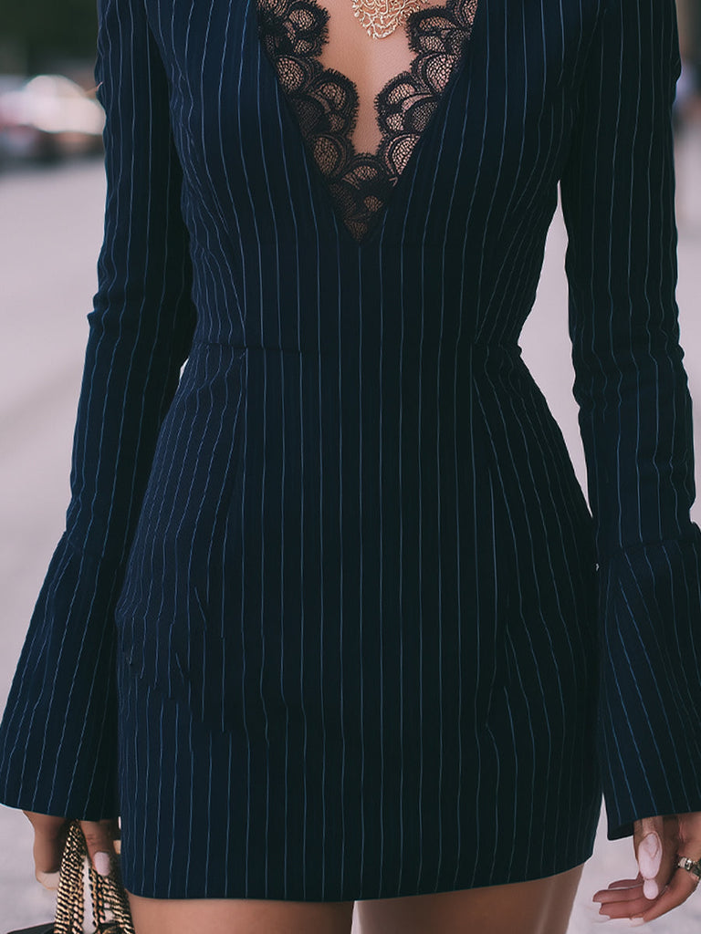 Mooyius introduces a chic fusion of business elegance and bold femininity with this navy pinstripe blazer dress. The sophisticated pinstripe pattern is contrasted by a daring lace v-neckline, adding a touch of allure to the structured silhouette. With flared cuffs and a tailored fit, this dress is a perfect balance of power and sensuality.