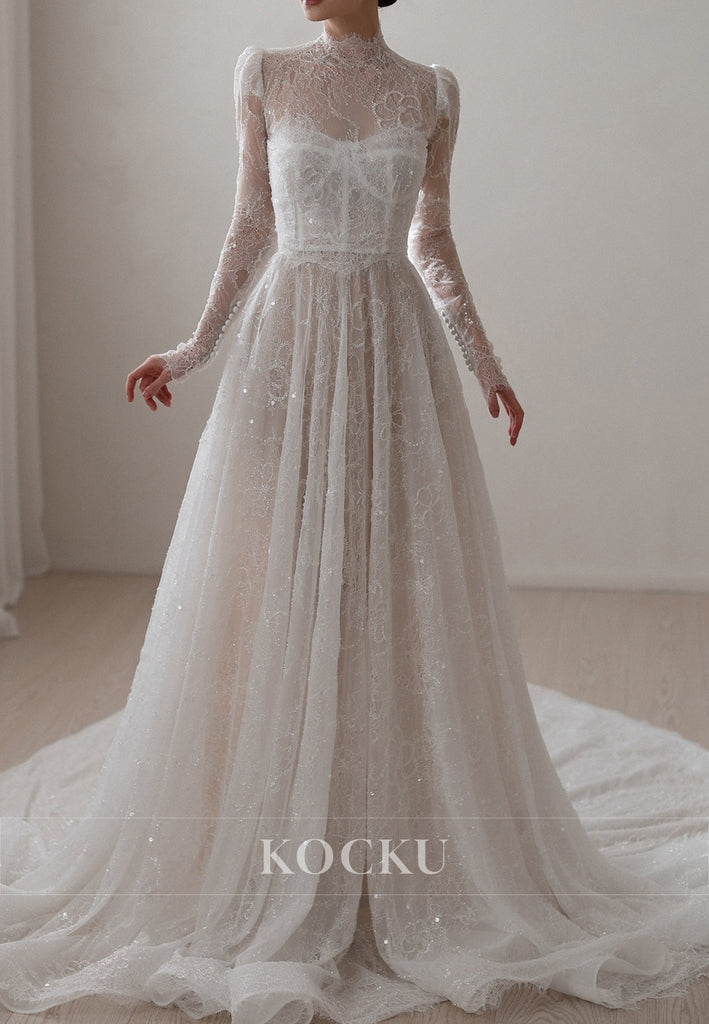 V-Neck A-Line Long Sleeves Wedding Dress High Split Sweep Train Satin Bridal Gowns with Beads