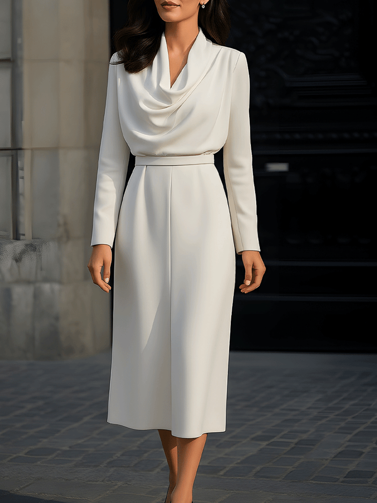 Ivory Long-Sleeve Midi Dress With Flared Skirt