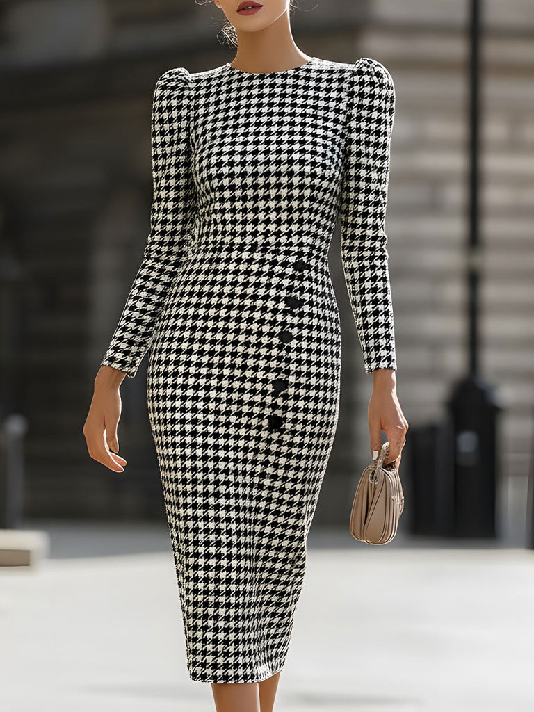 KOCKU Retro-Chic Houndstooth Midi Dress With Puff Shoulders