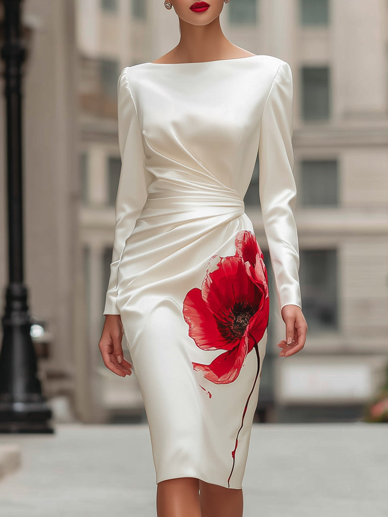 KOCKU Belted Boatneck Pencil Dress In Porcelain White