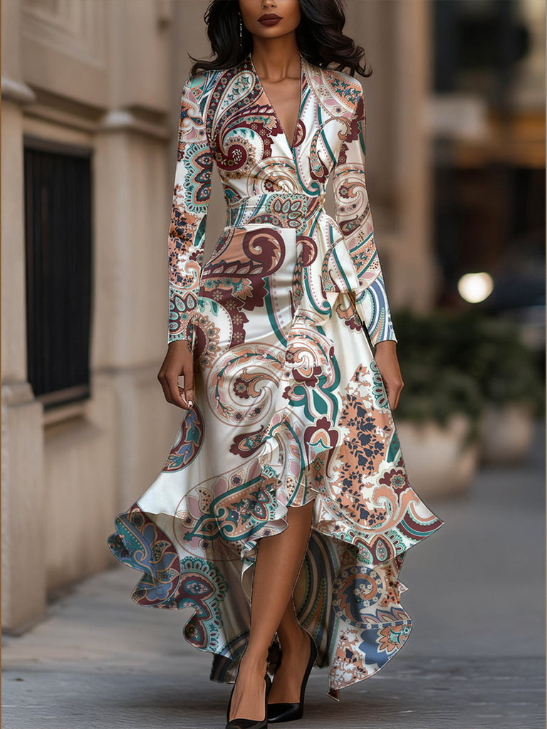 Paisley Print Wrap Dress With Belted Waist And High-Low Hem