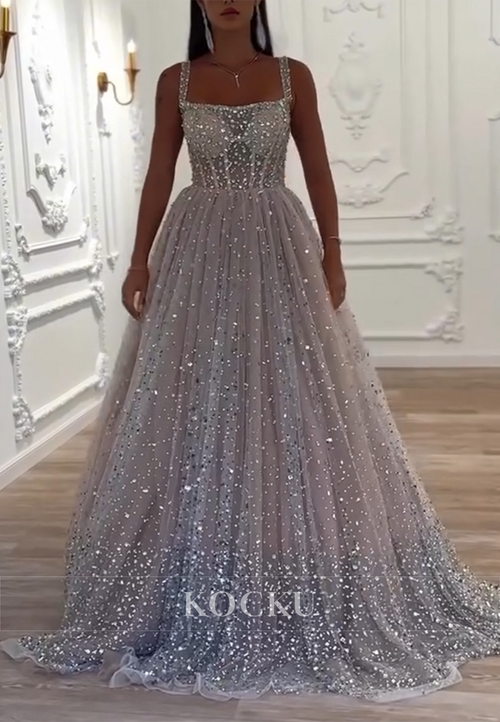 A-Line Square Tulle Rhinestone Pleated Wedding Dresses with Court Train