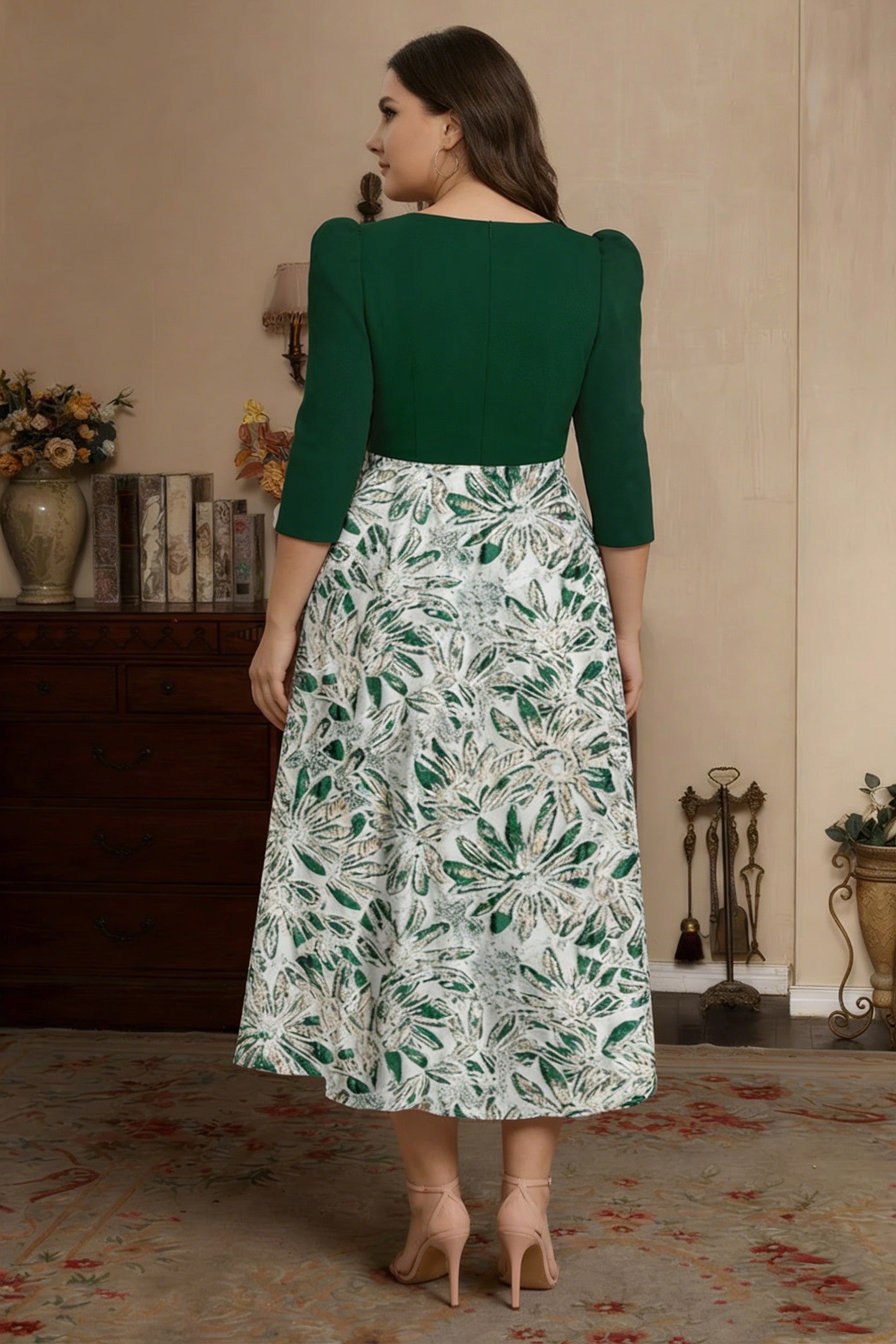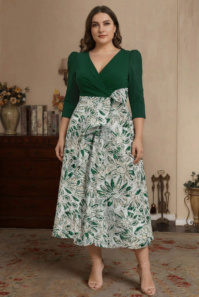 Elegant and timeless, this princess-style mother of the bride dress combines sophistication with comfort. Crafted from luxurious satin, it features a flattering V-neckline and flattering pleats that create graceful movement. The 3/4 sleeves provide modest coverage while the tea-length hemline offers a classic silhouette. Delicate floral detailing and a charming bow accent enhance the romantic aesthetic. Designed in plus sizes to ensure a perfect fit for every figure, this dress is ideal for weddings, formal events, and special occasions where you want to look and feel your absolute best.