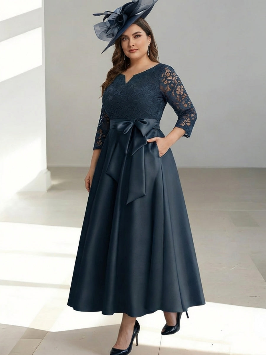 Elegant and timeless, this A-line mother of the bride dress combines sophistication with comfort. The flattering V-neckline and structured satin fabric create a refined silhouette, while delicate lace adorns the 3/4 sleeves for added grace. The ankle-length cut with a charming bow detail offers a polished finish. Designed in plus sizes, this dress celebrates every figure with confidence and style, making it perfect for your special day.