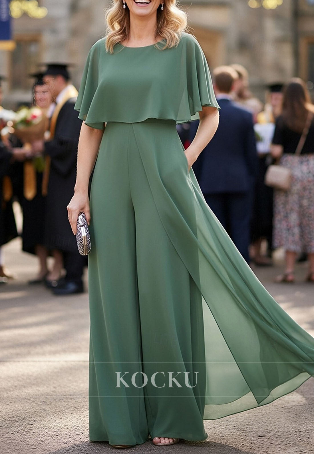 Bateau Neck Short Sleeves Chiffon Mother of the Bride Jumpsuit - Green is backordered and will ship as soon as it is back in stock.