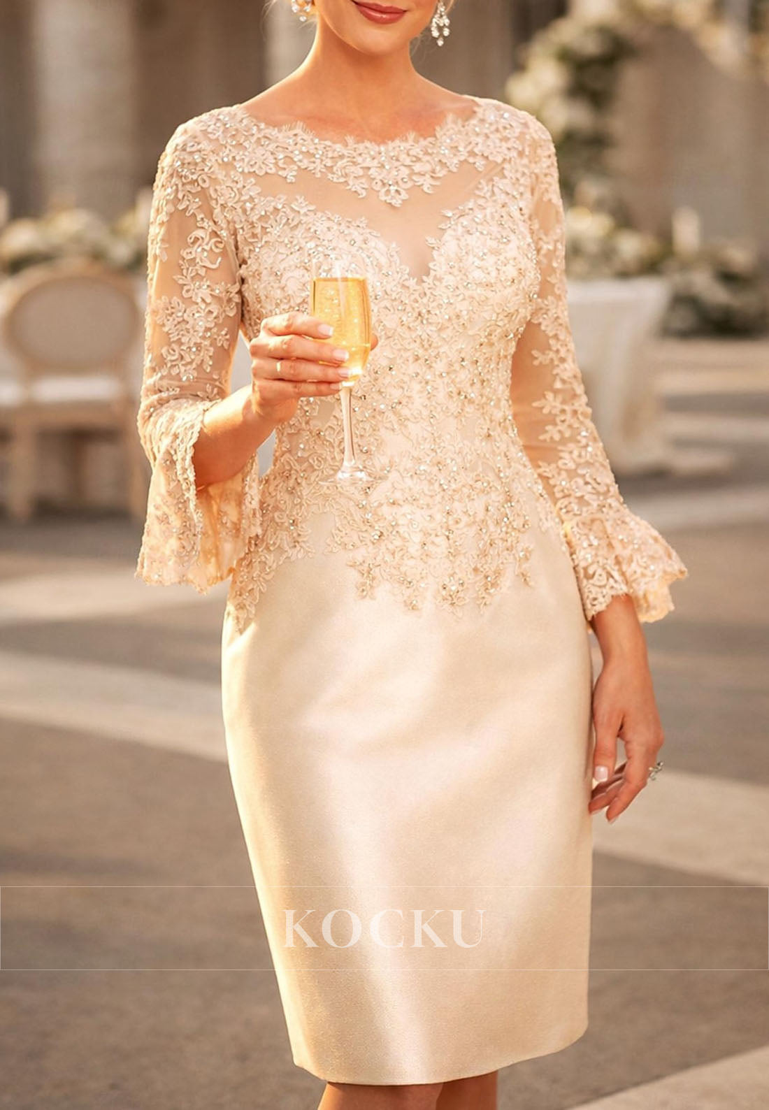 Elegant champagne mother of the bride dress featuring a classic bateau neckline and long sleeves for timeless sophistication. The delicate lace bodice adds refined detail, while the sheath silhouette creates a flattering, streamlined look. Perfect for weddings and formal celebrations, this dress combines grace with understated glamour. Designed to make you feel confident and beautiful on your special day.