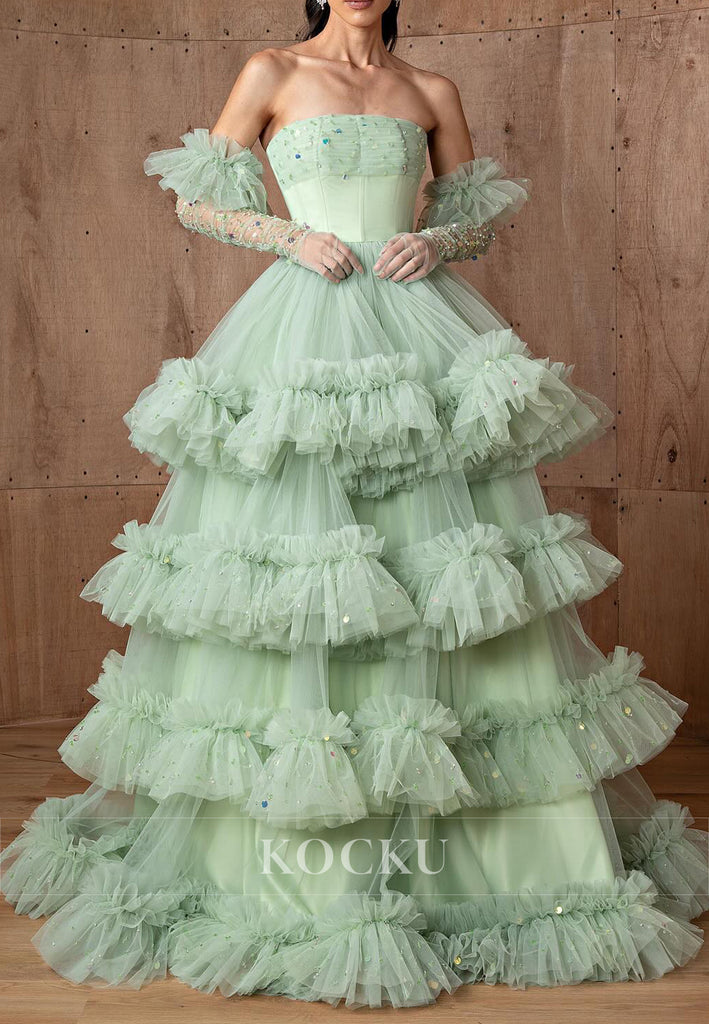 Mint Green - A-Line Strapless Sequins Tulle Prom Dresses with Court Train