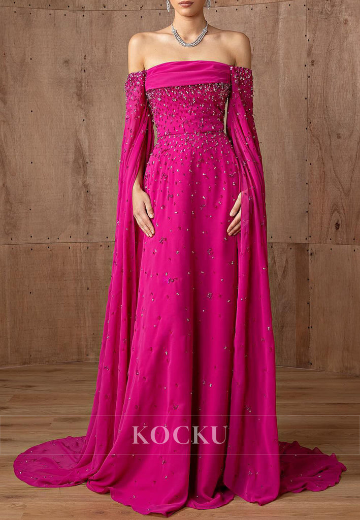 A-Line Off the Shoulder Sequined Embossed Fuchsia Pleated Prom Dresses