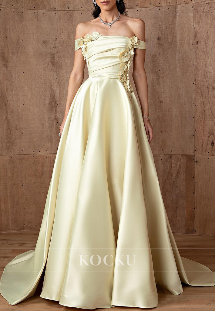 A-Line Off the Shoulder Pleated Floral Embellished Prom Dresses with Court Train