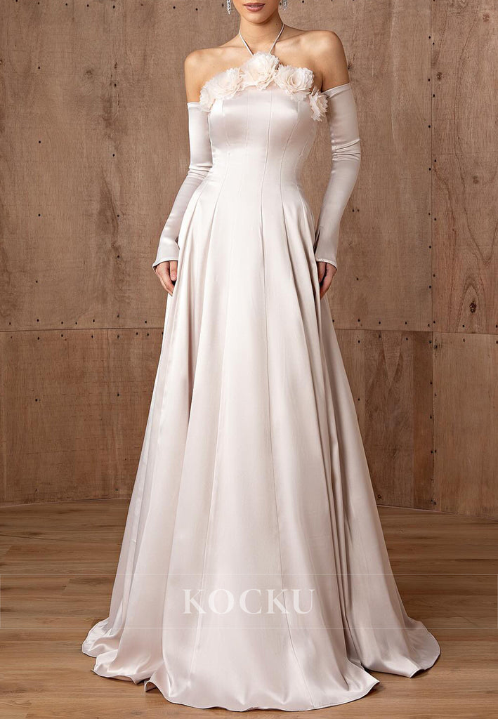 A-Line Halter Long Sleeve Flowers Embossed Floor-Length Prom Dresses