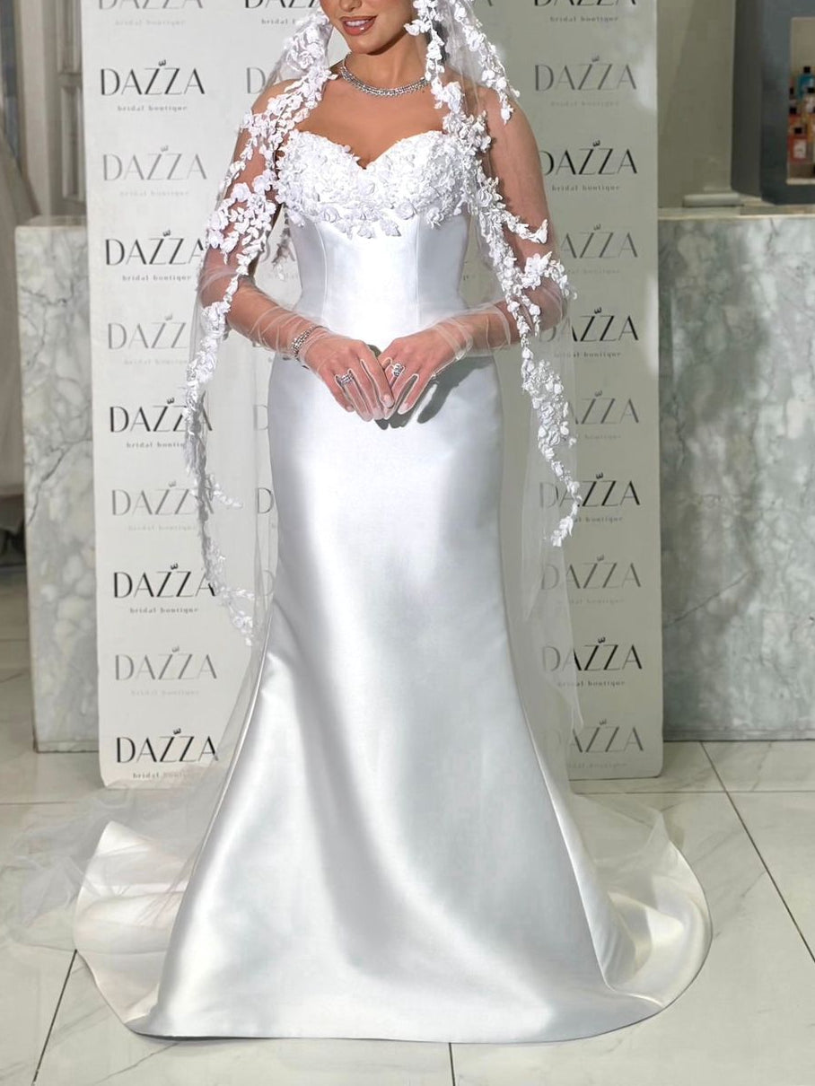 Elegant and timeless, this mermaid wedding dress features a luxurious satin fabric with delicate floral detailing that catches the light beautifully. The sweetheart neckline frames the shoulders gracefully, while the sleeveless design offers a refined, modern silhouette. The fitted bodice flows into a dramatic mermaid skirt that creates an enchanting, romantic movement as you walk. Perfect for the bride seeking understated glamour and classic sophistication on her special day.