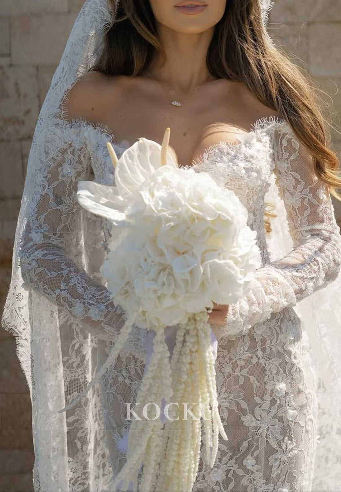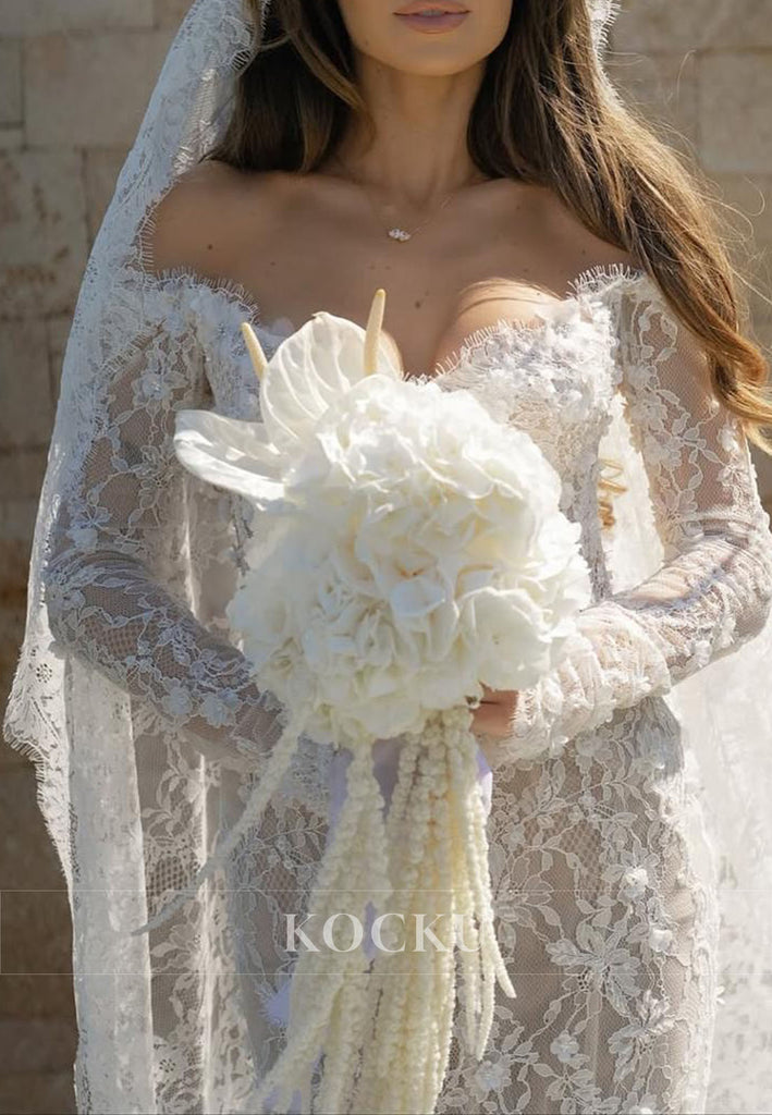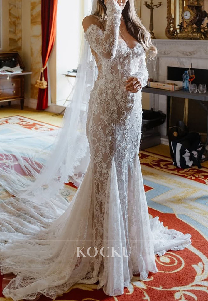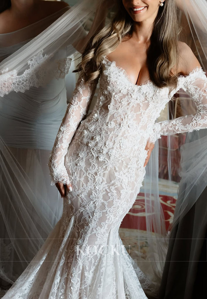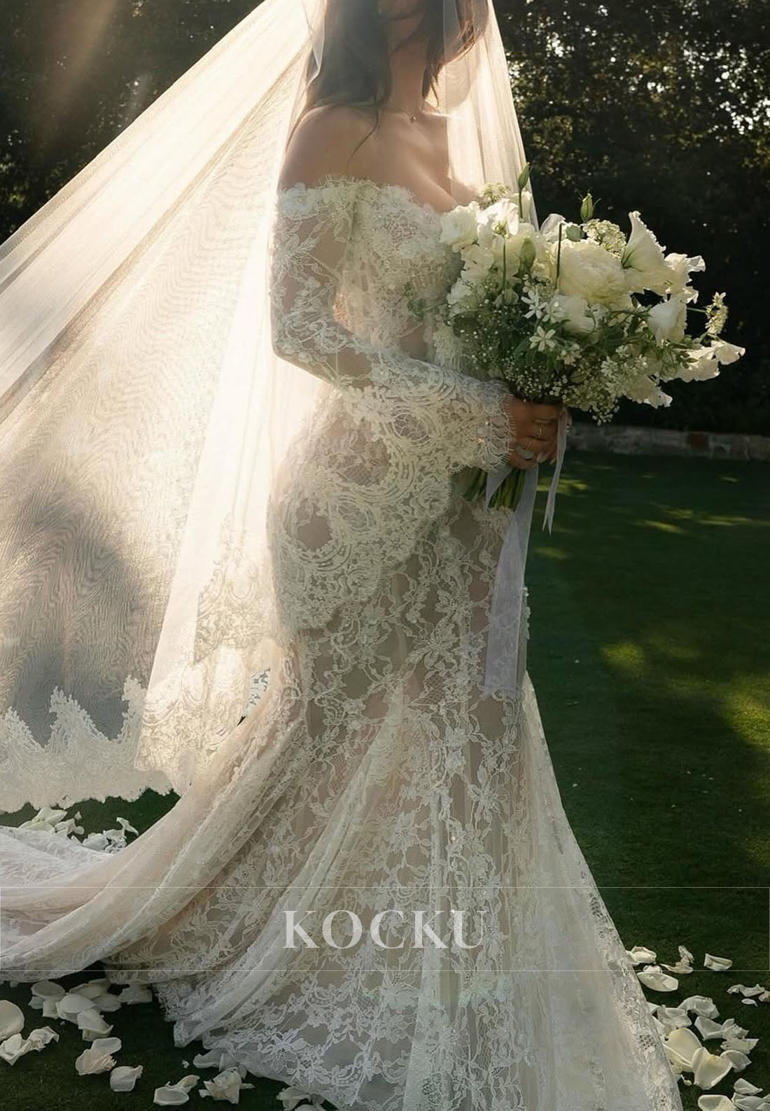 Lace Appliqued Long Sleeves Off Shoulder Court Train Wedding Dress