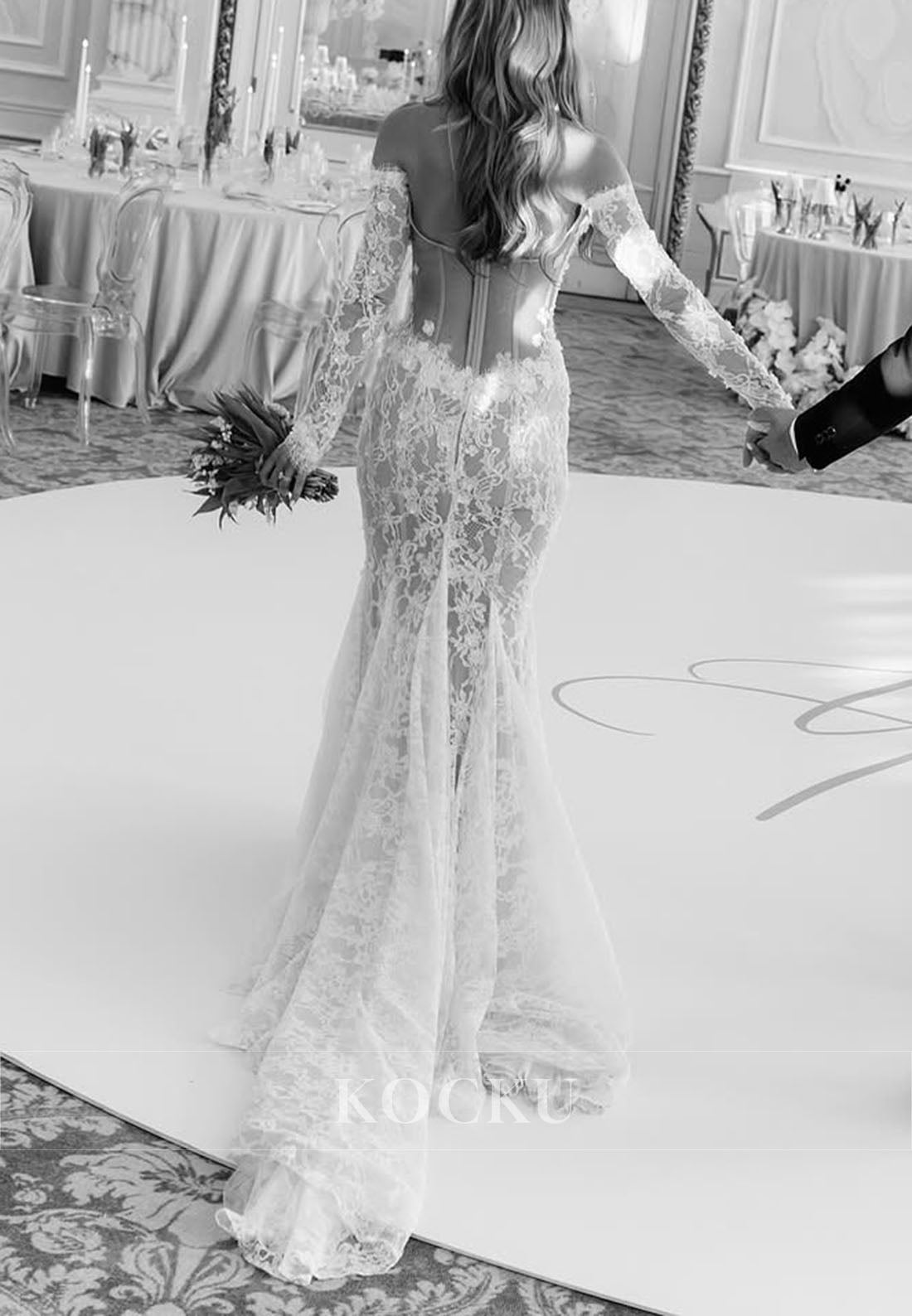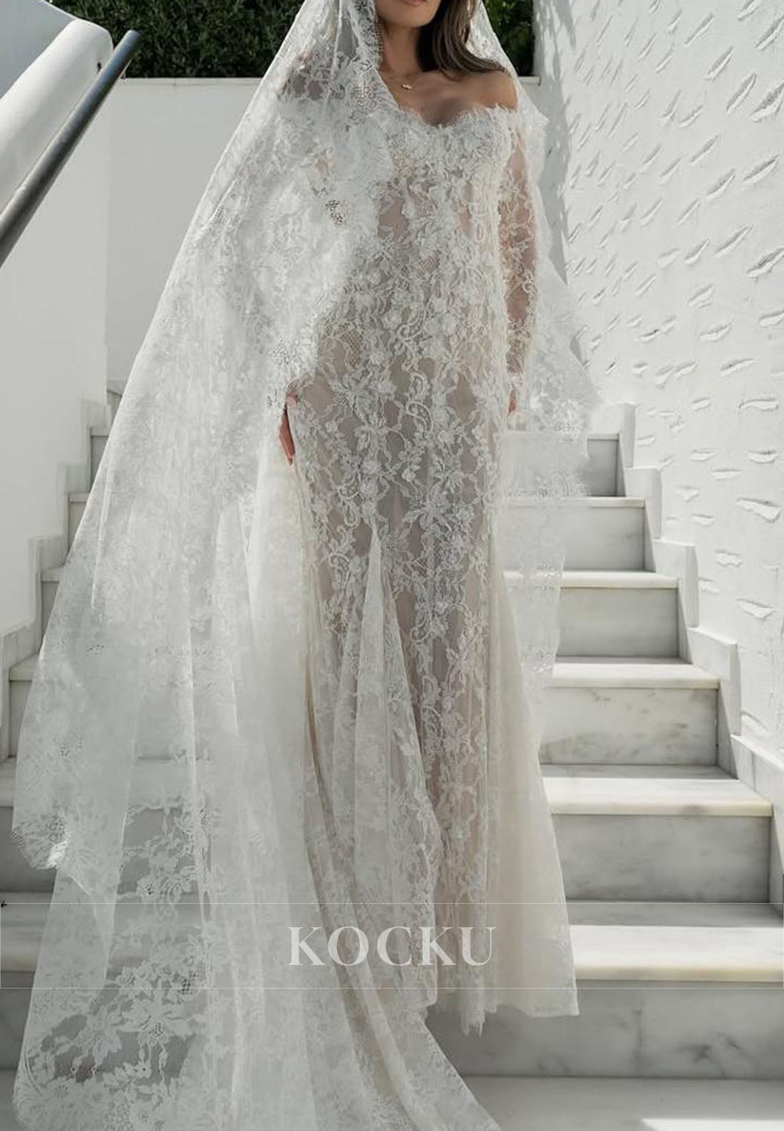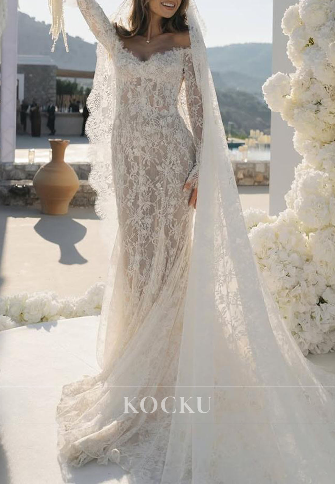 Lace Appliqued Long Sleeves Off Shoulder Court Train Wedding Dress