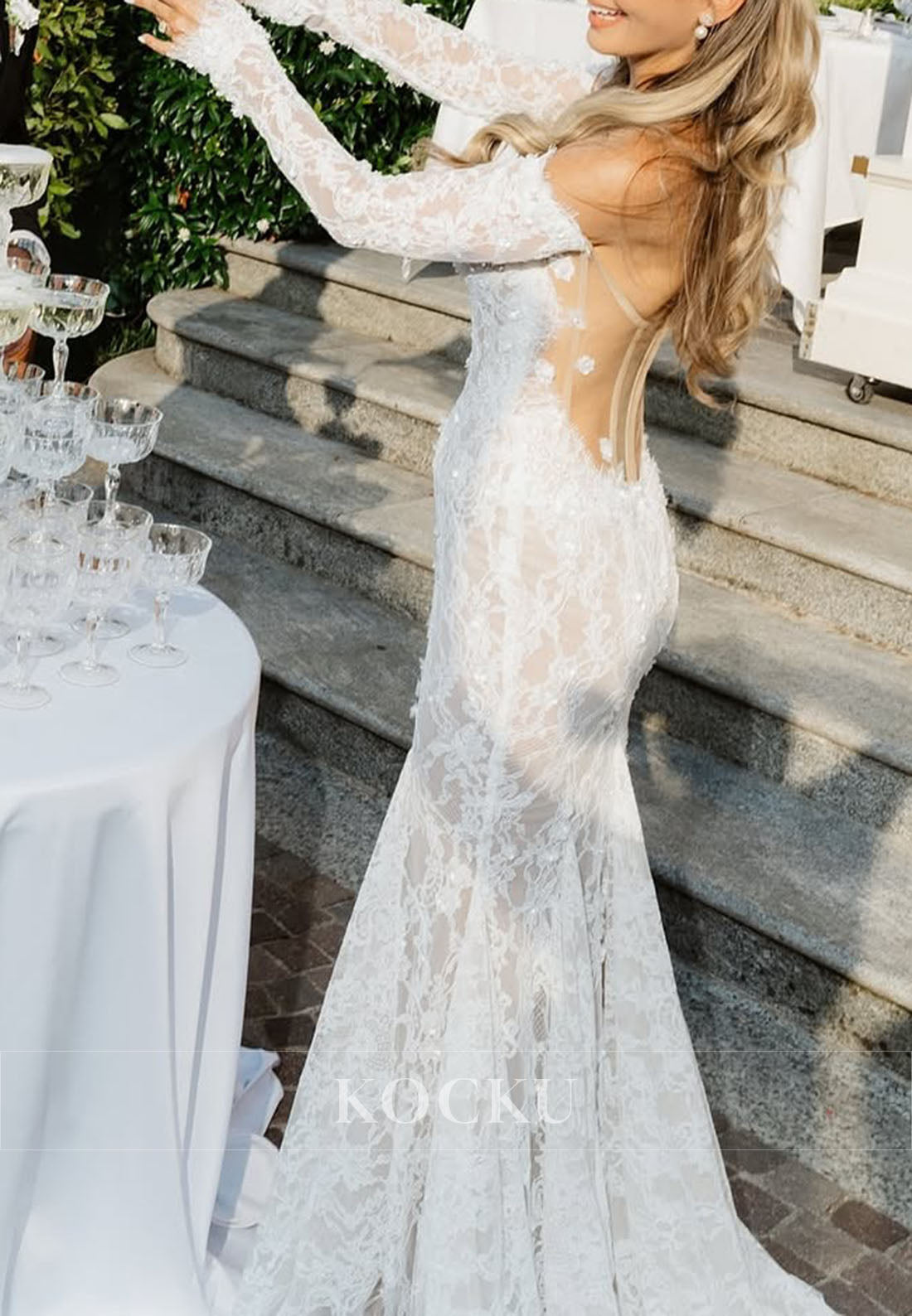 This exquisite wedding dress combines romantic details with refined elegance. Delicate lace appliqués adorn the bodice and sleeves, creating intricate visual interest while the off-shoulder neckline offers a soft, feminine silhouette. Long sleeves provide graceful coverage and timeless appeal, while the sweeping court train adds dramatic flair as you walk down the aisle. The carefully balanced design ensures you feel both confident and enchanting on your special day. Ideal for brides who appreciate intricate craftsmanship and desire a gown that transitions seamlessly from ceremony to celebration.
