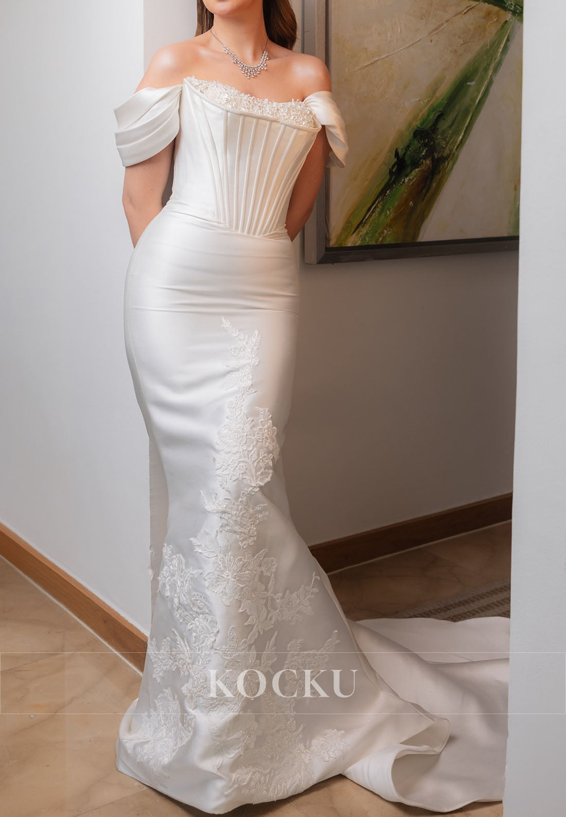 Mermai Satin Embroidery Off Shoulder Pleated Beaded Sweep Train Wedding Dress