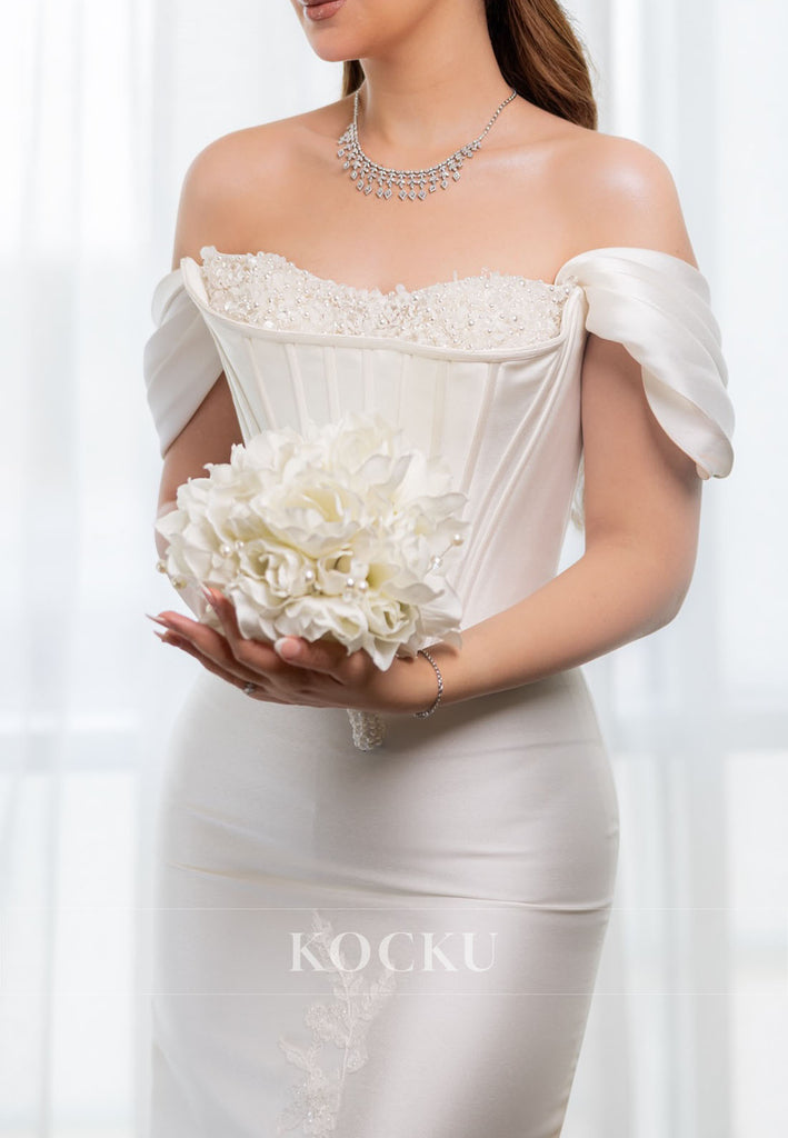 Indulge in luxury with this exquisite mermaid wedding dress crafted in sumptuous satin. The off-shoulder silhouette reveals the collarbone and shoulders with romantic allure, while intricate embroidery adorns the bodice with artisanal detail. Elegant pleating adds dimension and movement to the fitted silhouette, while radiant beading catches light beautifully throughout the day. A graceful sweep train follows behind you, creating a sense of occasion and flow. This gown seamlessly marries opulent fabrics with refined embellishments, making it perfect for the discerning bride who appreciates couture-quality construction and desires a dress that celebrates both elegance and individuality.