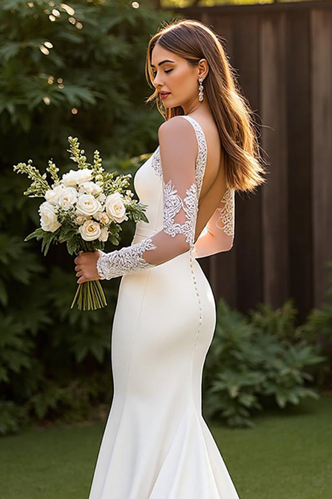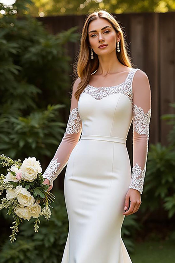 This ivory wedding dress features a refined mermaid silhouette that contours the body elegantly. Crafted with delicate lace detailing, it combines classic charm with modern simplicity. The square neckline offers a flattering frame, while the court train adds a graceful finish, perfect for a sophisticated bridal look. Ideal for brides seeking understated elegance and timeless design.