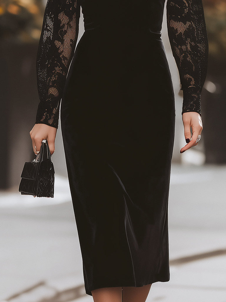 KOCKU presents the black midi dress is crafted to flatter and define your silhouette. Featuring a figure-hugging velvet bodice, delicate lace sleeves and upper chest panel, and a high neckline, this dress blends vintage romance with modern allure. The long, sheer lace sleeves add a touch of elegance, making it a perfect choice for both special occasions and chic evening outings.