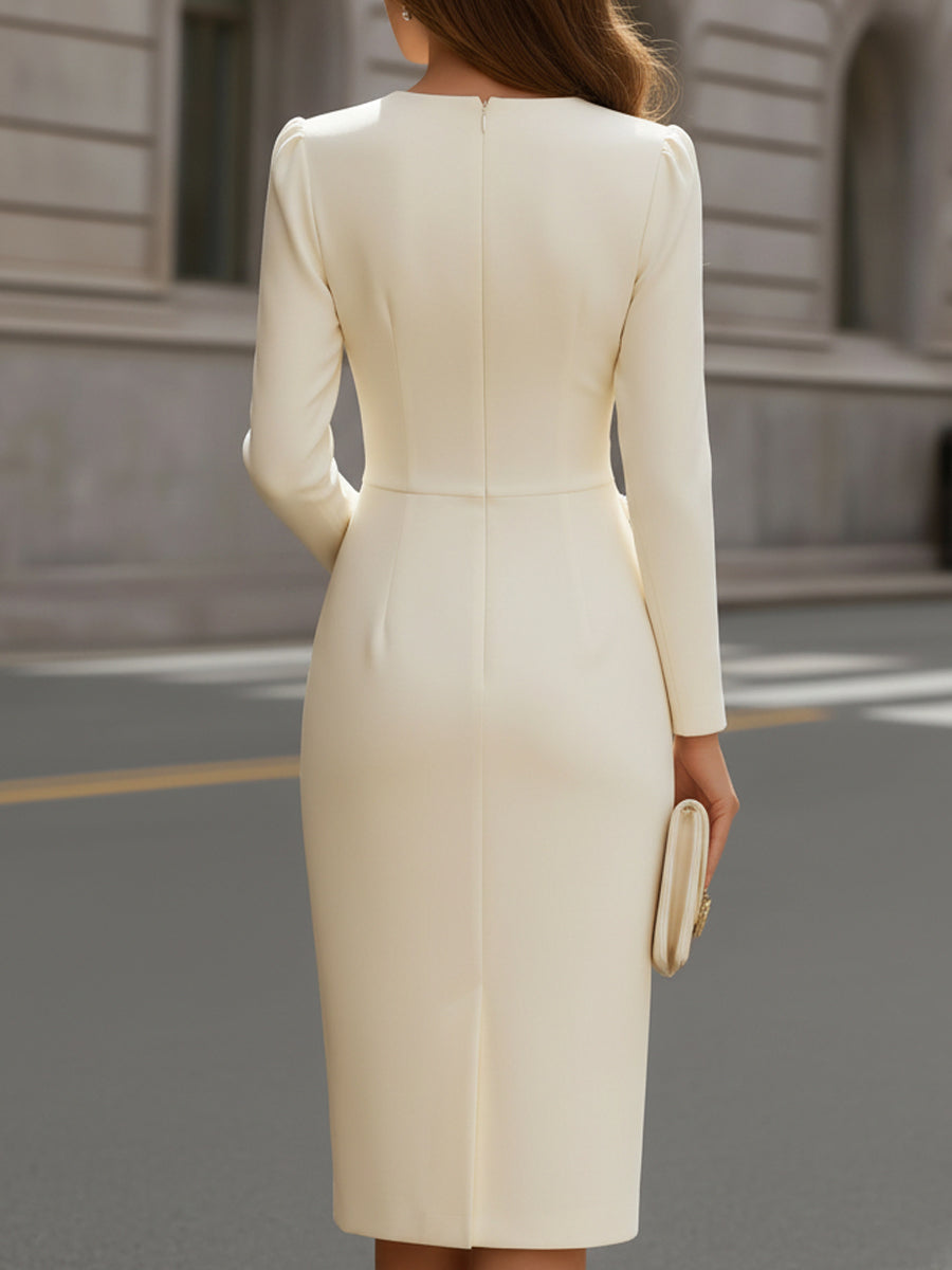 This elegant midi dress is designed to embody refined femininity and modern tailoring, making it a sophisticated choice for polished wardrobes. Featuring a clean notched neckline, the design subtly elongates the neckline while maintaining a composed and professional aesthetic. The long sleeves and structured shoulders create a balanced silhouette that feels confident, timeless, and impeccably tailored.