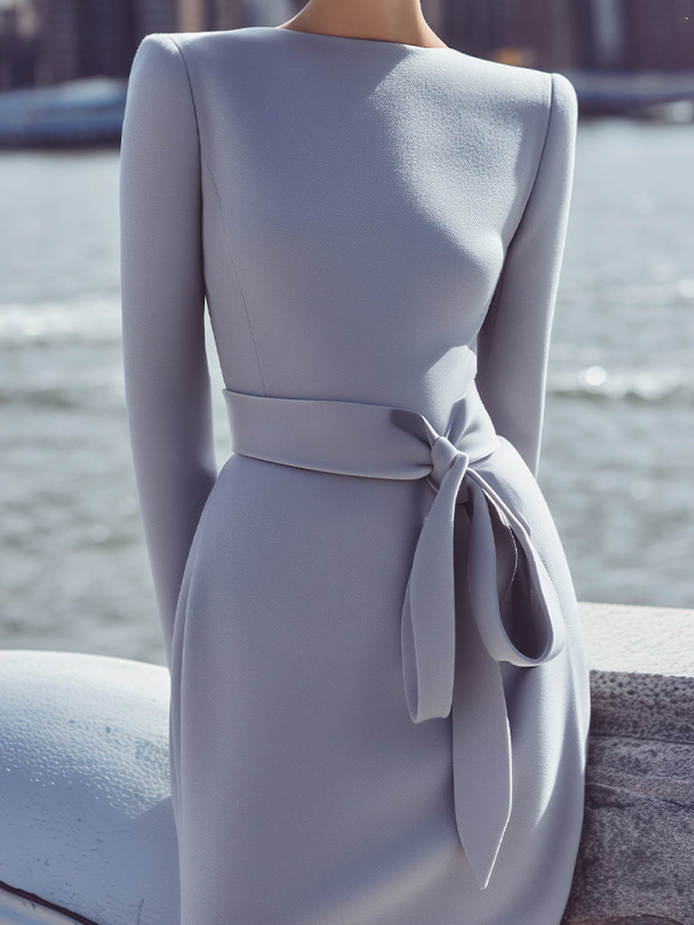 The highlight of the design is its tonal belt, seamlessly integrated at the waist and tied into a soft knot, lending dimension and effortless charm. A bateau neckline elongates the frame with grace, while the long fitted sleeves balance simplicity with poise. Falling just above the knee, this dress embodies polished refinement—ideal for women who value elegance without excess.