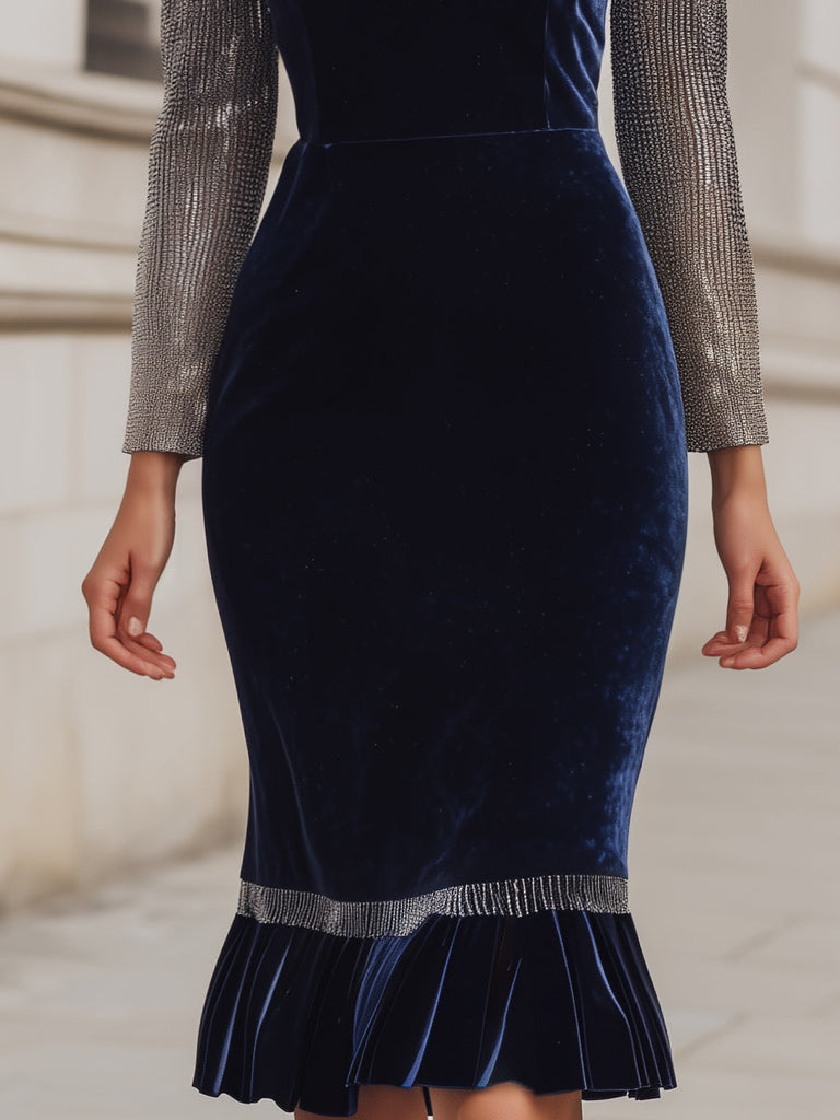 KOCKU presents an extraordinary fusion of elegance and modern edge with this Midnight Velvet Dress. Crafted from plush navy velvet, the design is elevated by shimmering silver metallic sleeves that create a striking contrast while exuding refined glamour.