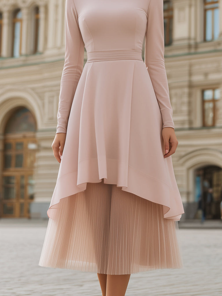 The top features a high mock neckline and long fitted sleeves, offering balanced coverage that accentuates the body’s natural line. A structured bodice defines the waist before cascading into an asymmetric overlay skirt, revealing a delicate pleated tulle underlayer that adds movement and dimension. The combination of clean lines and subtle texture reflects KOCKU’s signature harmony between sophistication and softness.