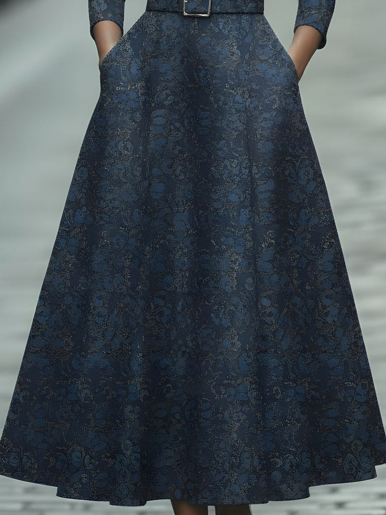 Navy Blue Floral Jacquard Belted Dress With V-Neckline