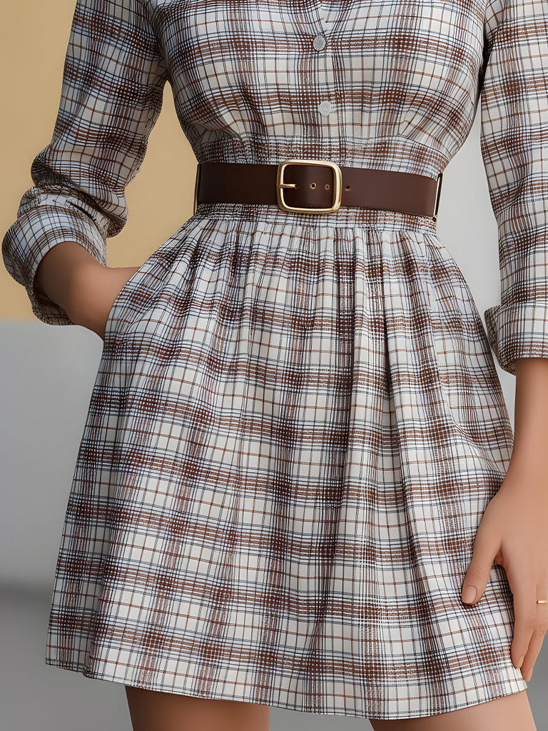 This KOCKU Plaid Dress brings a fresh take on a classic style. The timeless checkered pattern in soft brown and white gives this dress a vintage-inspired charm, while the flattering A-line silhouette and belt create a feminine and effortless look.