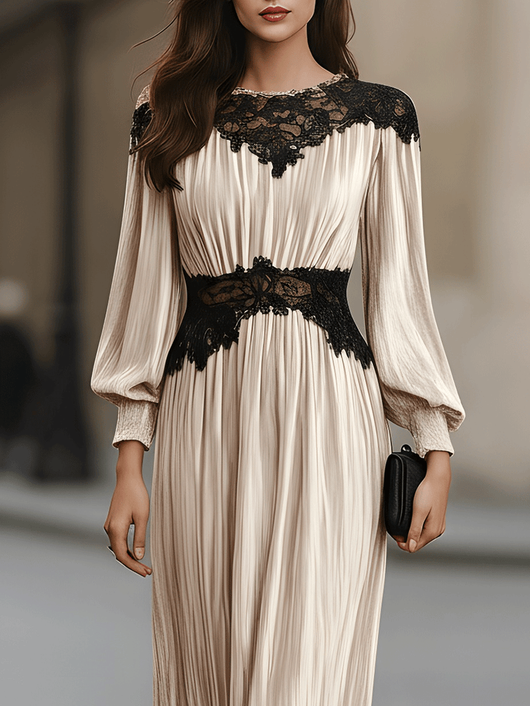 KOCKU presents a luxurious pleated velvet dress that combines refined elegance with romantic details. This beige dress features a high-neck lace overlay that beautifully contrasts with the soft pleats, creating a sophisticated yet alluring silhouette. The black lace around the waist and shoulders adds a delicate touch of drama, while the long sleeves and flowing skirt ensure a flattering fit.
